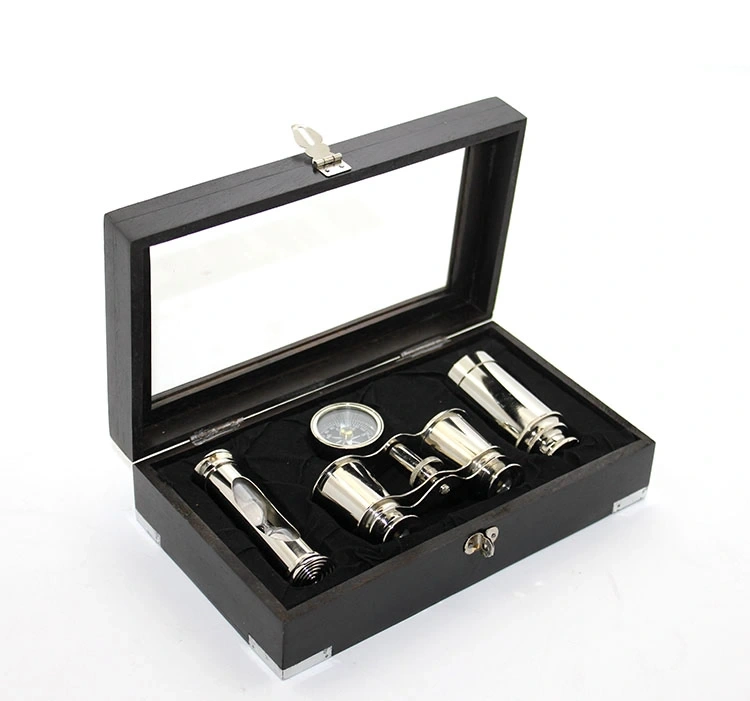 Ahşap Kutulu Pirinç Dürbün Pusula Ve Kum Saati Seti