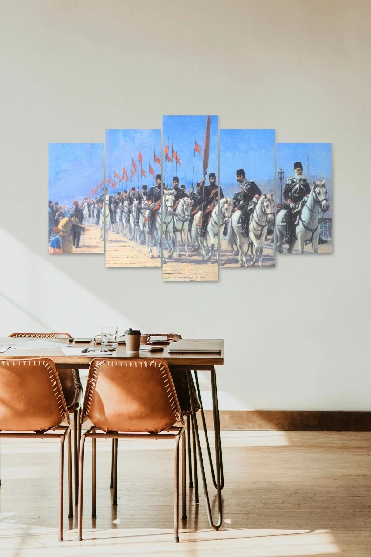 Modern tasarımıyla dikkat çeken bu 5 parçalı MDF tablo, evinizin dekorasyonuna şık bir dokunuş katıyor; Ahşap malzemesi sayesinde dayanıklılık ve uzun ömürlü kullanım sunuyor; Atlı birlikler manzarası temalı bu tablo, mekanınıza tarihi bir hava katarken aynı zamanda estetik bir görünüm sağlıyor;