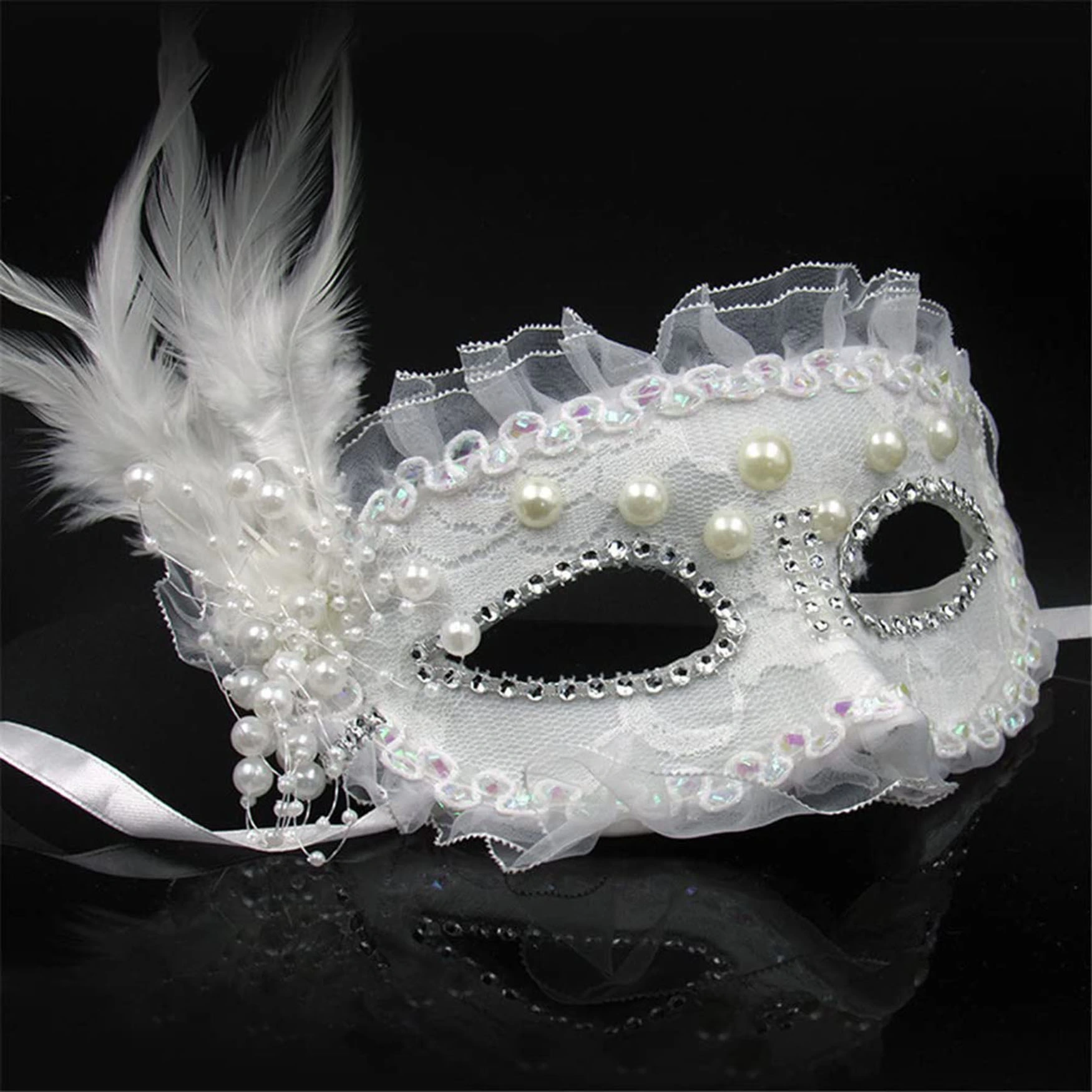 Beyaz Renk Yandan Tüylü İnci İşlemeli Taşlı Dantelli Parti Maskesi, balolar, maskeli partiler veya özel geceler gibi özel günlerde zarif ve göz alıcı bir görünüm elde etmek isteyenler için mükemmel bir seçimdir. Beyaz dantel kaplaması, zarif incileri ve yandan sarkan tüyleri ile bu maske sizi partinin en şık ve zarif konuğu yapacak.