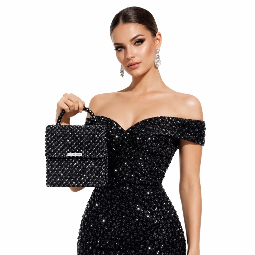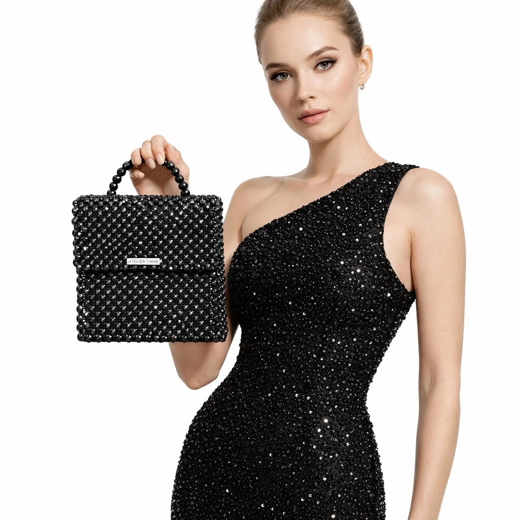Çanta gövdesi, 8 mm standart yuvarlak kesim optik sınıfı kristal boncukların, yüksek dayanımlı monofilament misina kullanılarak yüksek yoğunluklu düz örgü tekniğiyle tek tek işlenmesi sonucu tamamen el işçiliğiyle oluşturulmuştur. Kristallerin sık ve homojen dizilimi, yüzey boyunca kesintisiz bir parlaklık sağlarken; örgü yapısı çantanın desteksiz şekilde formunu koruyabilen rijit bir yapı kazanmasını mümkün kılar.