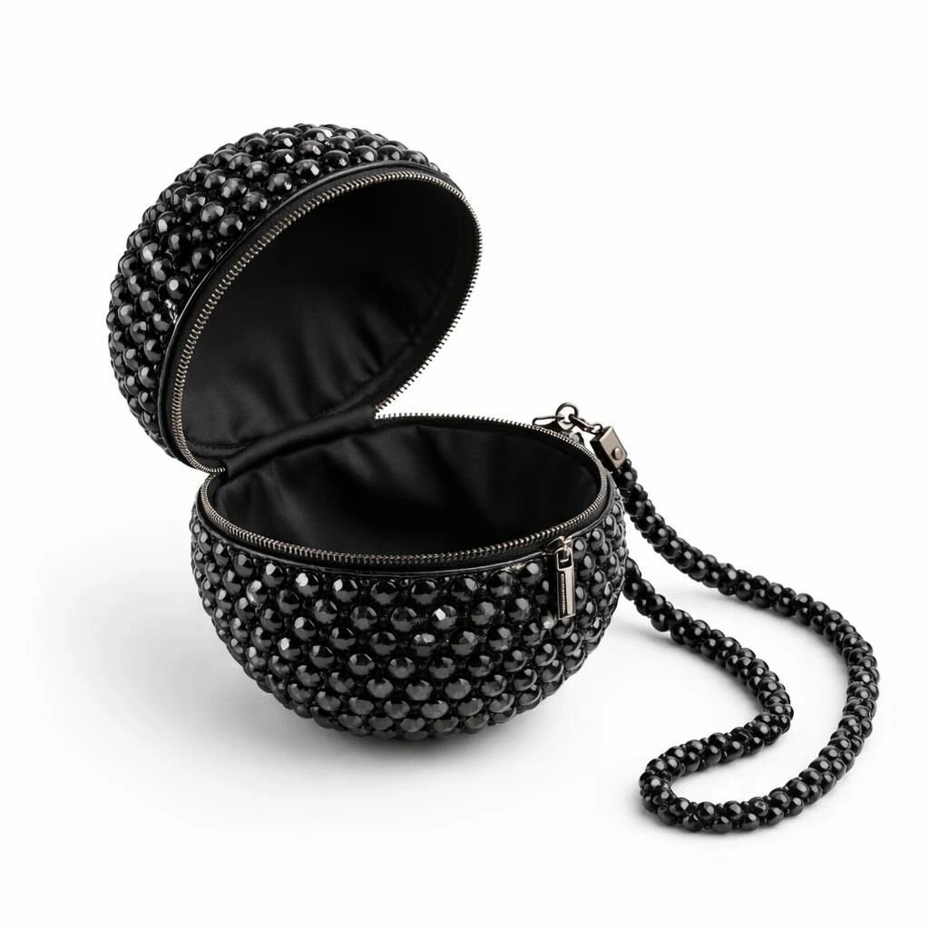 Modelin üst bölümünde yer alan metal fermuarlı kapatma sistemi, küresel yapıya entegre edilerek tasarlanmış; fermuar hattı, form bütünlüğünü bozmadan çantanın çevresini takip edecek şekilde konumlandırılmıştır. Fermuar çekme ucu ve metal aksesuarlar, kristal dokuyla kontrast oluşturmadan, dengeli bir parlaklık sunar.