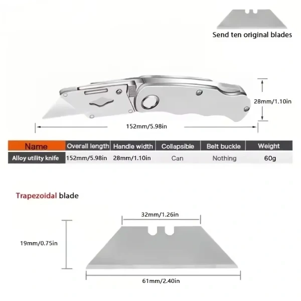 CARPET UTILITY KNIFEProduct DescriptionWith its durable and ergonomic design, the carpet utility knife is an ideal solution for users who want to make precise and controlled cuts on various surfaces. The ergonomic and non-slip handle design minimizes hand fatigue during extended use. The blade can be easily replaced when dull, and spare blades are included in the package. It is equipped with a locking mechanism for safe use, preventing the blade from slipping during cutting. Its foldable design makes it very easy to carry and store. It provides long-lasting use with its stainless steel blade and durable body.Product FeaturesThe carpet utility knife enhances user comfort with its ergonomic and non-slip handle design. The stainless steel blade is supported by a durable plastic and metal body. The replaceable blade feature offers practical use. The locking mechanism ensures safe use, and its foldable structure makes the product easy to carry.Package Contents1 carpet utility knifeSpare blades