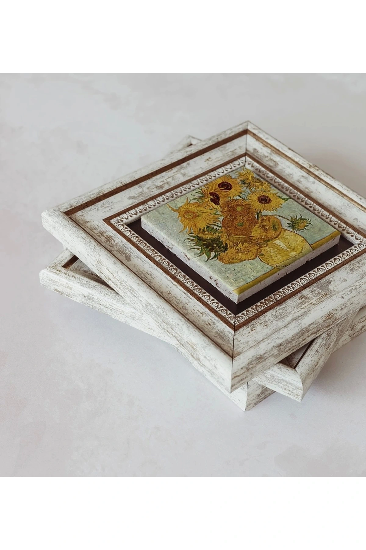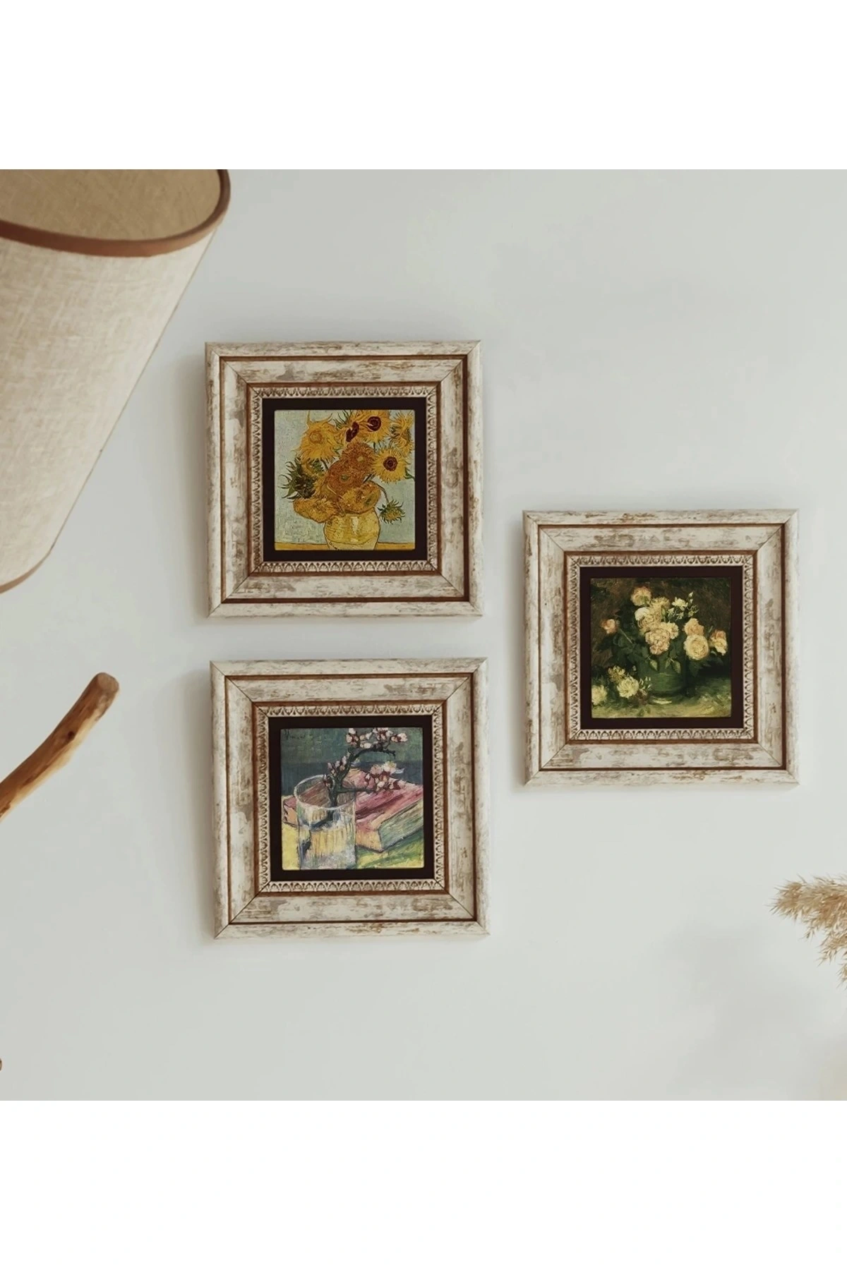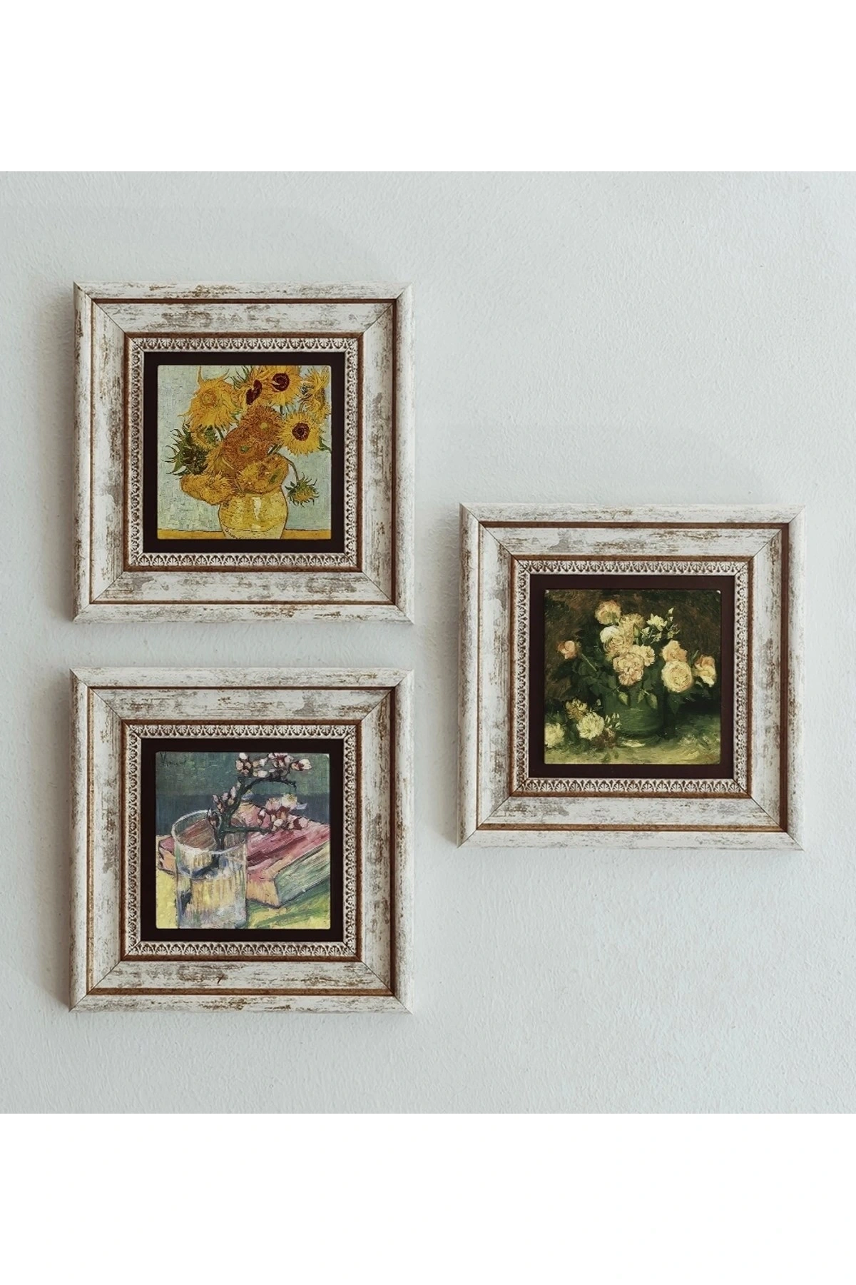 Çiçek Tasarımlı 3'lü Çerçeveli Taş Tablo , Çerçeveli Taş Duvar Dekoru 20 cm