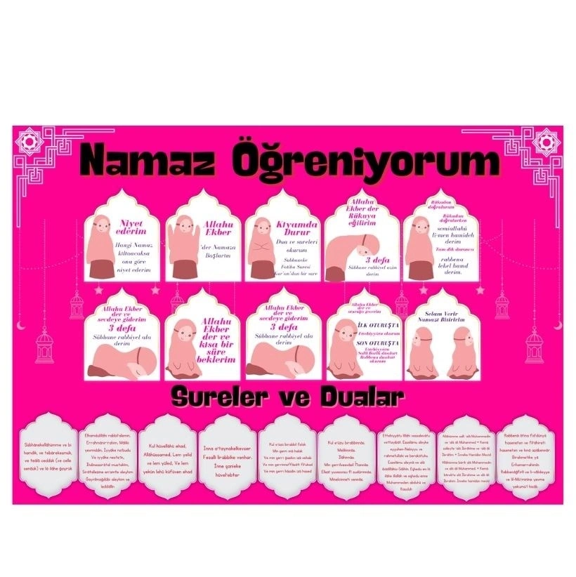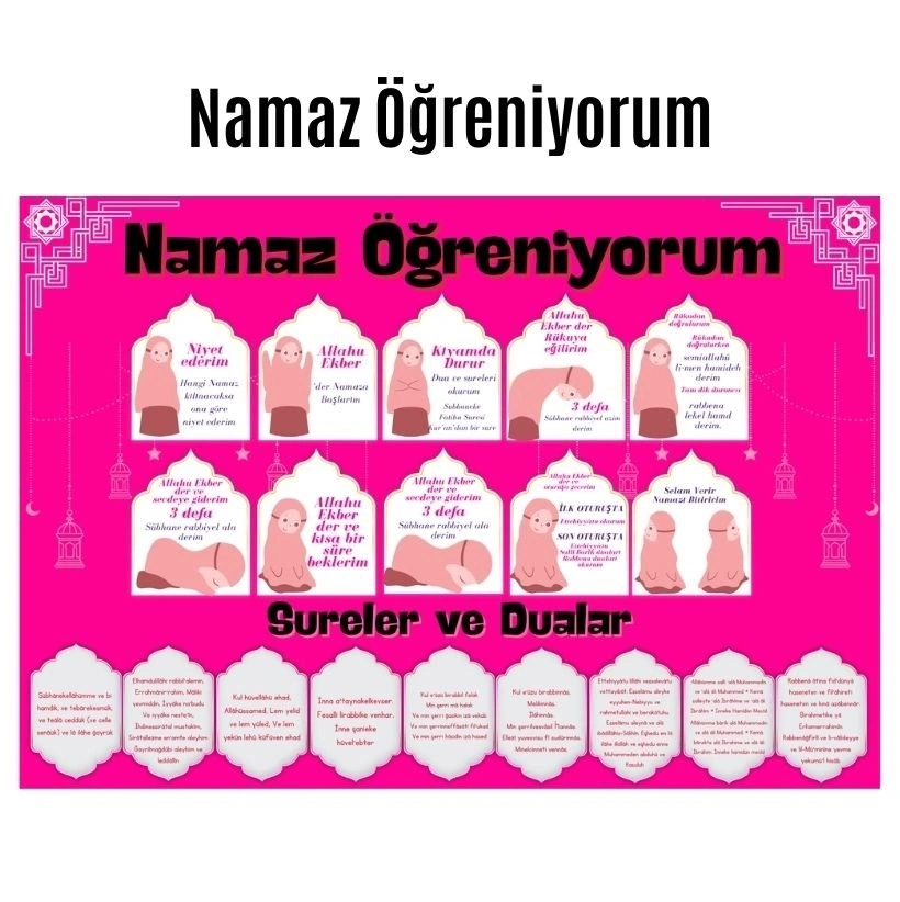 Namaz kılmayı öğrenmek artık çok daha kolay ve eğlenceli! Renkli ve Figürlü "Namaz Öğreniyorum" Afişi , çocuklar için özel olarak tasarlanmış görseller ve sade anlatımlarla İslam'ın bu önemli ibadetini öğretmeyi amaçlıyor.