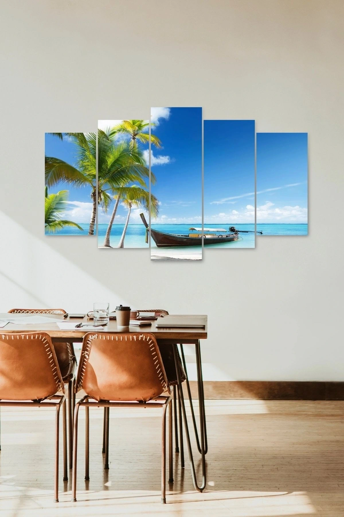 Modern tasarımıyla evinizin dekorasyonuna şıklık katan deniz manzarası temalı 5 parçalı MDF tablo; Dayanıklı ahşap malzemesi ile uzun ömürlü kullanım sunar ve estetik görünümüyle mekanınıza doğal bir dokunuş ekler; Deniz manzarası temalı bu tablo, huzur veren ve dinginlik hissi veren bir atmosfer yaratır;