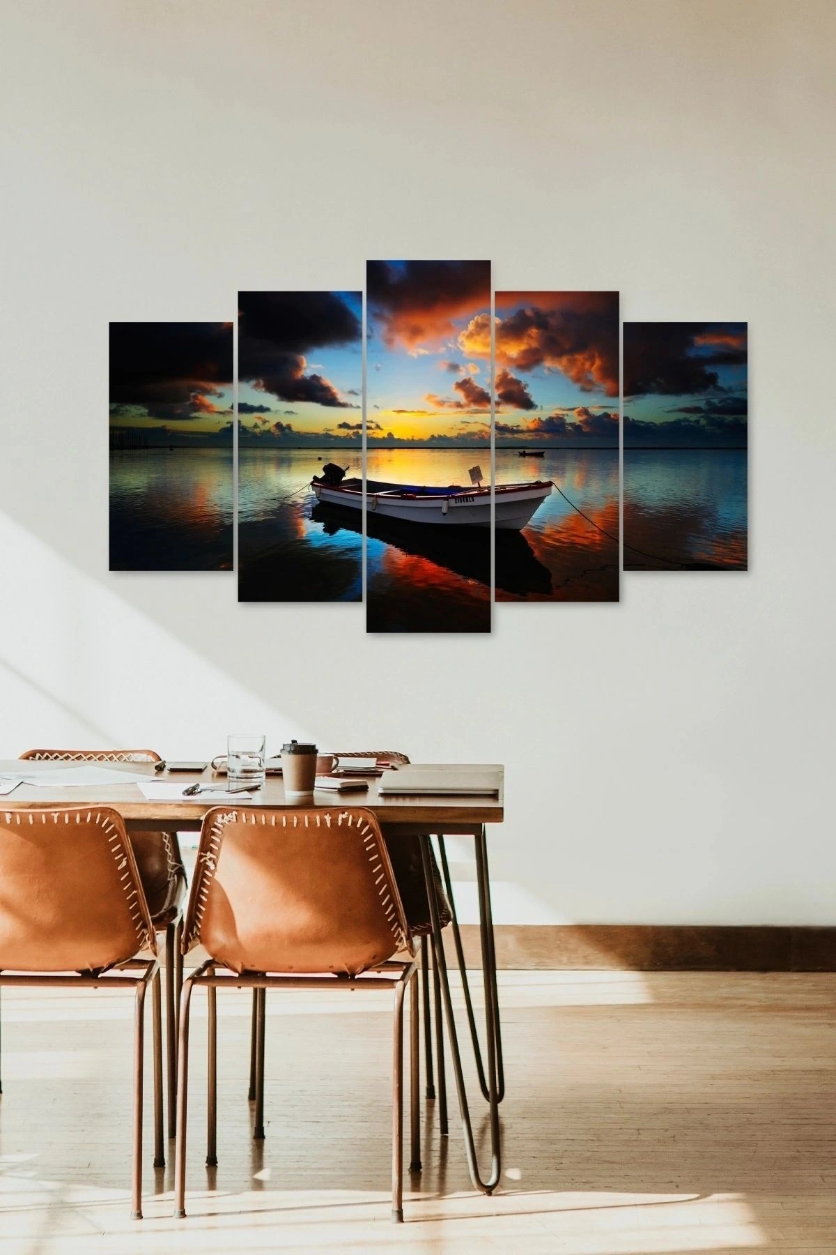 Modern tasarımıyla evinizin dekorasyonuna şıklık katan deniz manzarası temalı 5 parçalı MDF tablo; Dayanıklı ahşap malzemesiyle uzun ömürlü kullanım sunar ve estetik görünümüyle mekanınıza sıcak bir atmosfer katar; Deniz manzarası temalı bu tablo, huzur veren ve dinginlik hissi veren bir ortam yaratır;