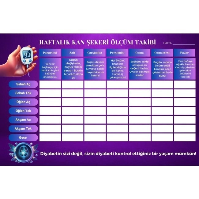 Diyabet Ölçüm Takip Çizelgesi Defteri, hem sağlık profesyonelleri hem de kişisel kullanım için ideal bir seçenektir. Diyabet yönetiminde düzen ve motivasyonu bir arada sunan bu özel tasarım defterle, hayatınıza sağlıklı bir yön verin.
