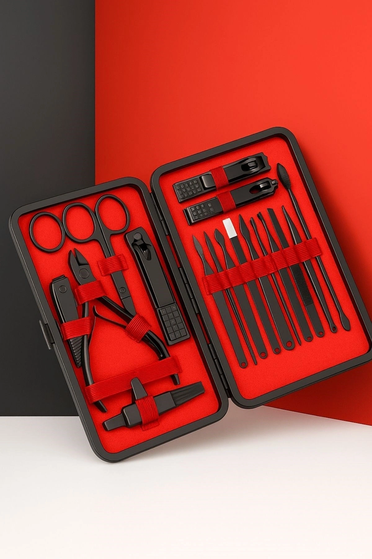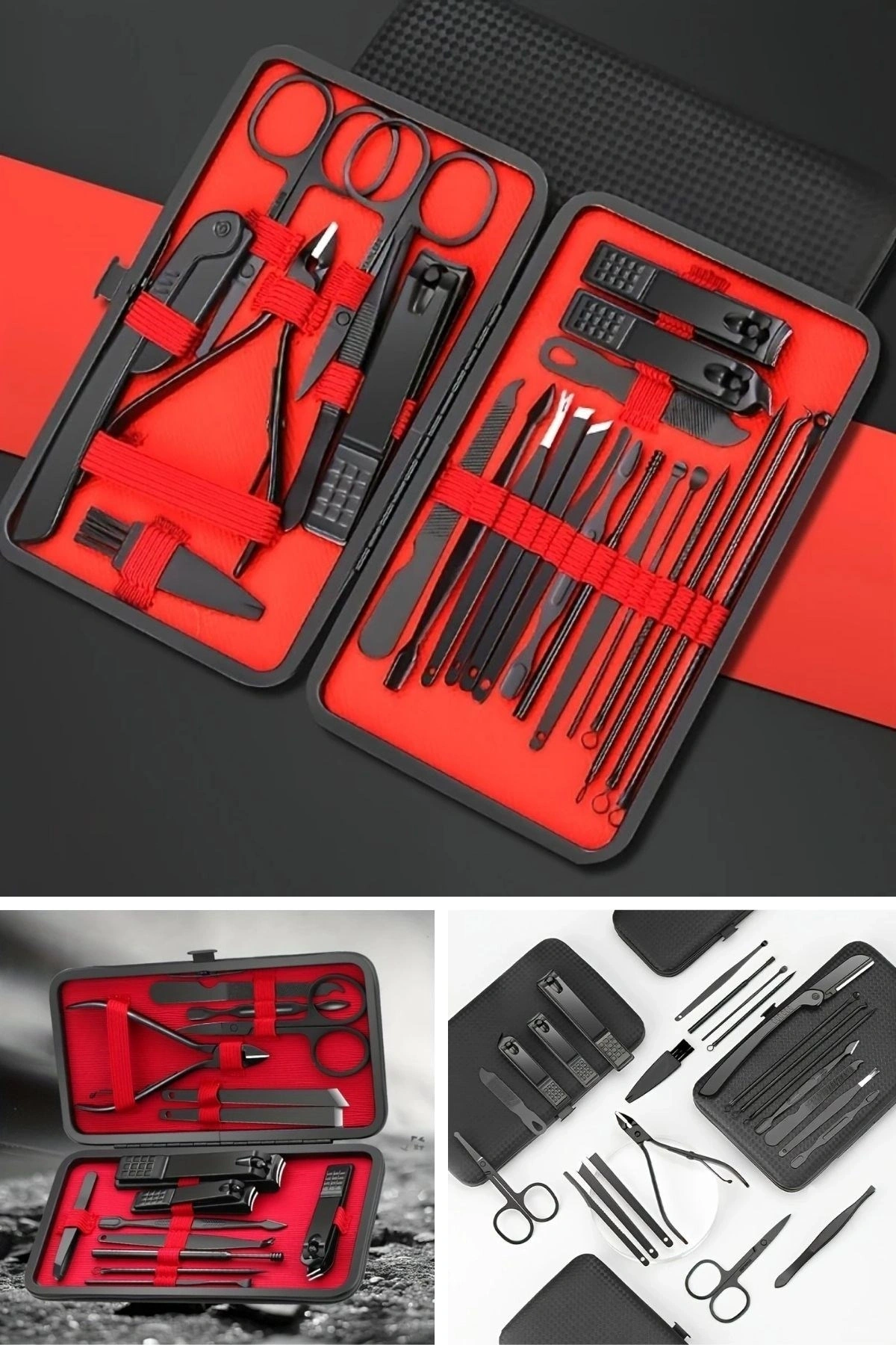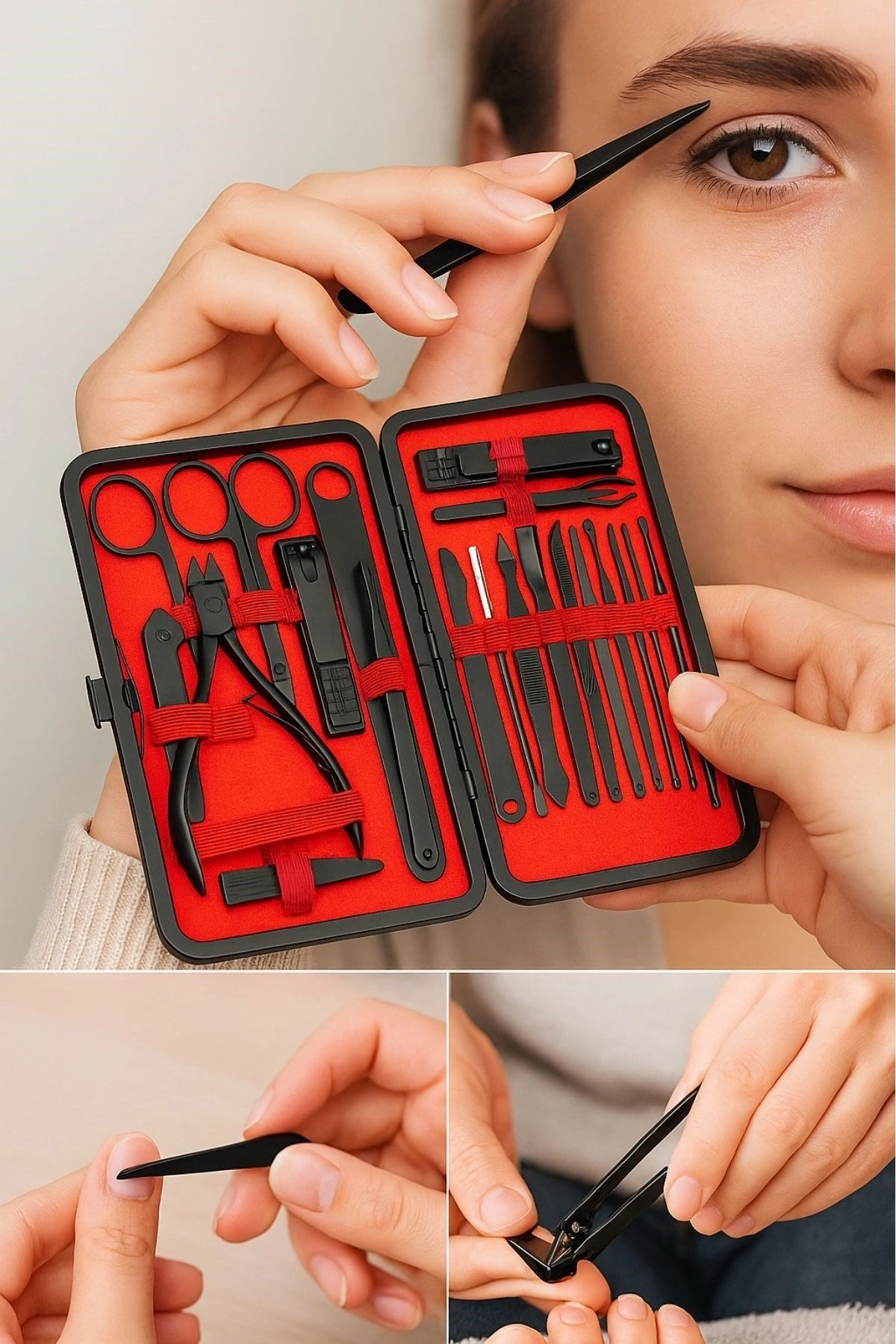 • 24 Parça Çok Amaçlı İçerik: Tırnak makası, törpü, cımbız, makas, kulak temizleyici, sivilce çıkarıcı, tırnak eti aparatı ve daha fazlası.