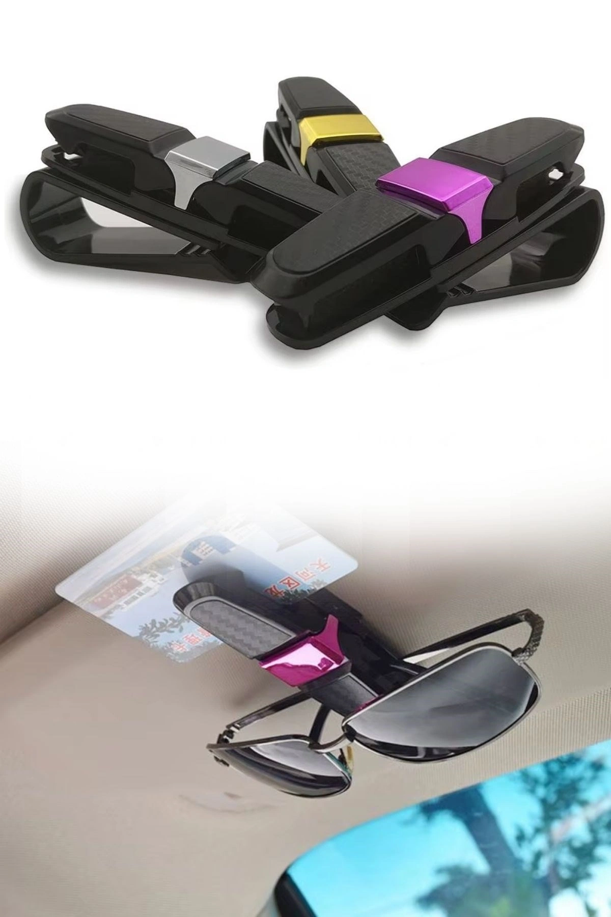 Araç İçi Güneşliğe Takılan 2'li Gözlük, Kart, Para Tutacağı Aparat, araç içindeki küçük eşyalarınızı düzenli ve erişilebilir bir şekilde saklamanız için tasarlanmış pratik bir aksesuardır.