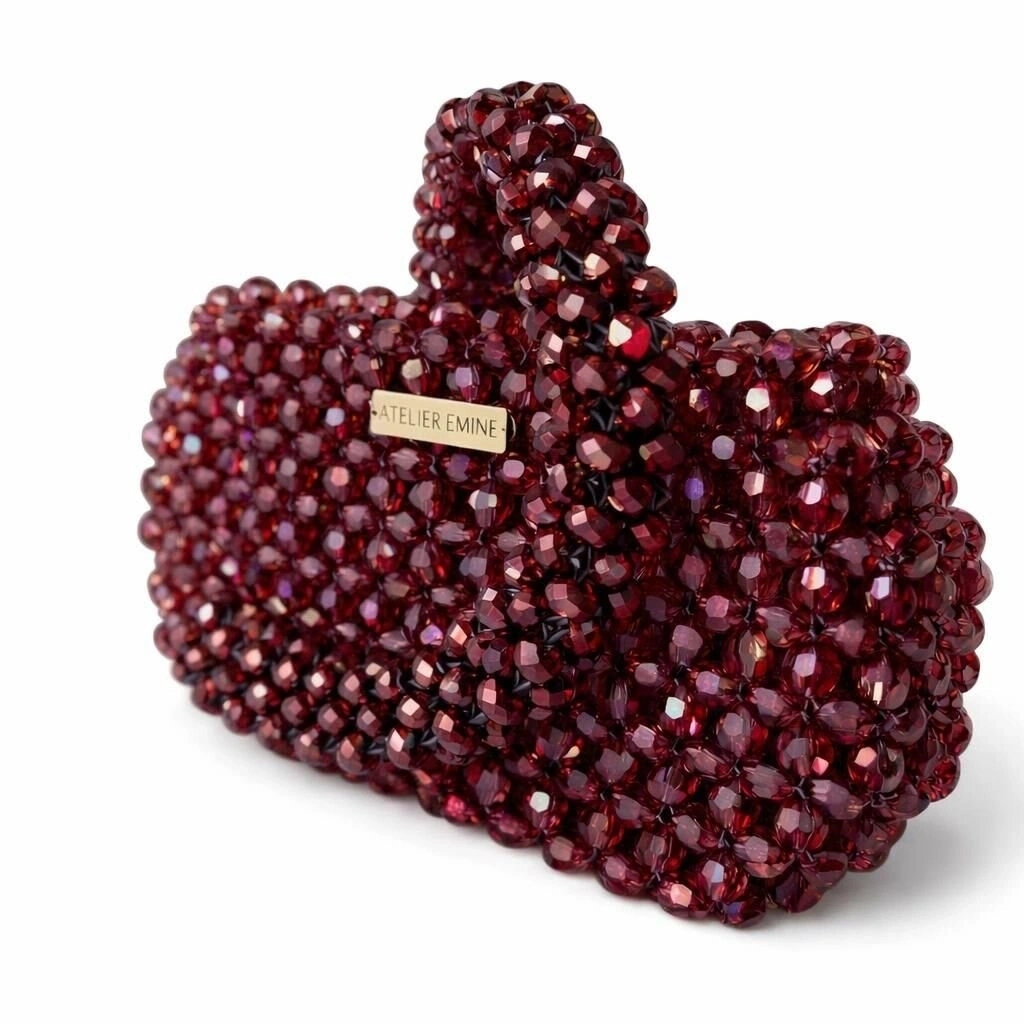Atelier Emine’in Crystal Gelato Couture koleksiyonuna ait Fresco Barolo, 8 mm standart yuvarlak kesim optik sınıfı kristal boncukların yüksek mukavemetli misina ile örülmesiyle tamamen el işçiliğiyle üretilmiş, yapısal formu ve mücevher etkili yüzeyiyle öne çıkan bir top-handle mini çanta modelidir.