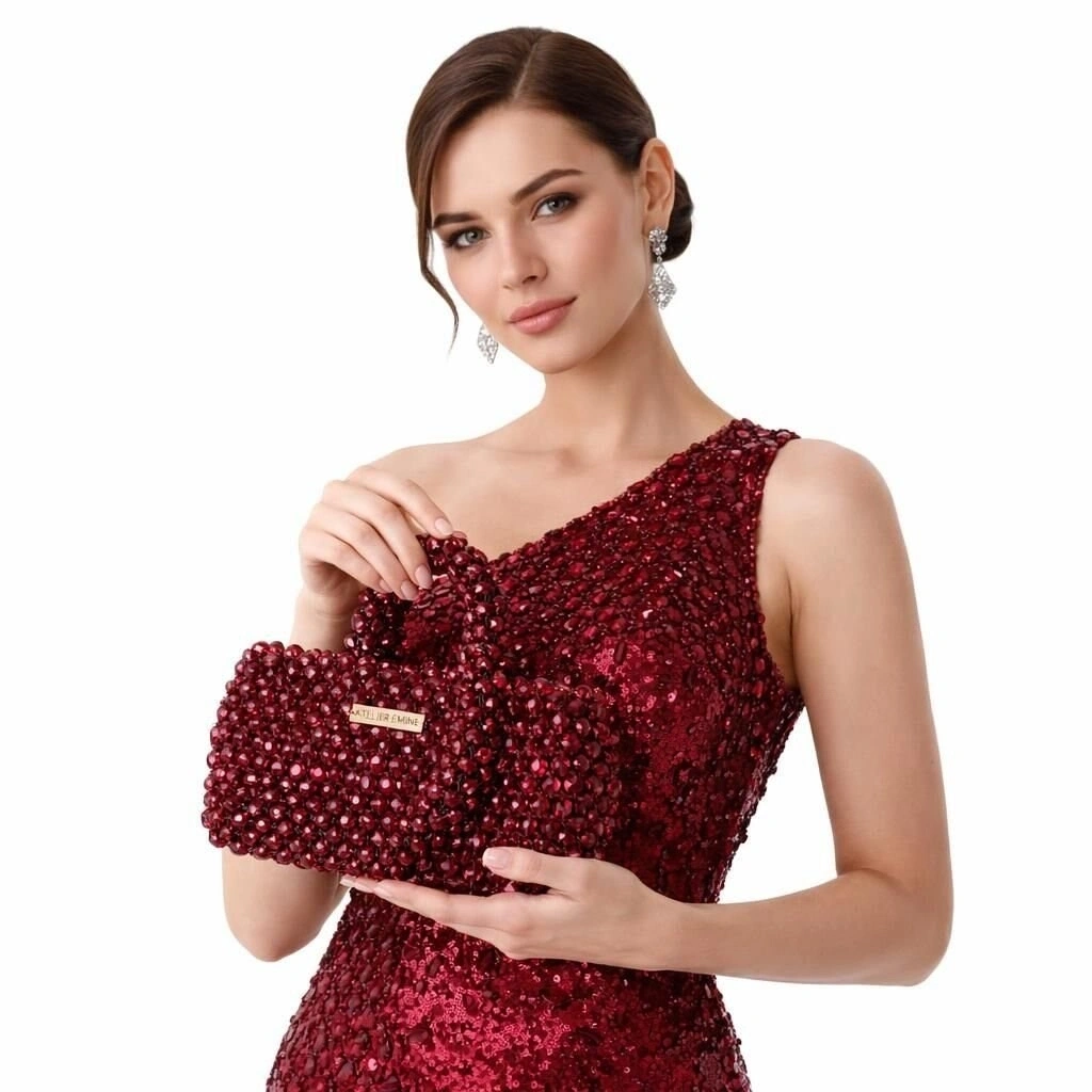 Kristal boncuklar, yüzeyde maksimum ışık kırılımı ve derinlik etkisi elde edilecek şekilde yoğun, modüler ve çok katmanlı bir örgü sistemi ile tek tek işlenmiştir. Gövde, keskin köşelerden arındırılmış ancak net hatlarla tanımlanmış dikdörtgen siluetiyle güçlü bir hacim dengesi sunar.