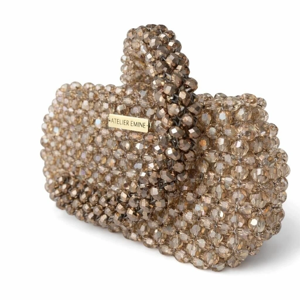 Atelier Emine’in Crystal Gelato Couture koleksiyonuna ait Fresco Clay, 8 mm standart yuvarlak kesim optik sınıfı kristal boncukların yüksek mukavemetli misina ile örülmesiyle tamamen el işçiliğiyle üretilmiş, yapısal formu ve mücevher etkili yüzeyiyle öne çıkan bir top-handle mini çanta modelidir.