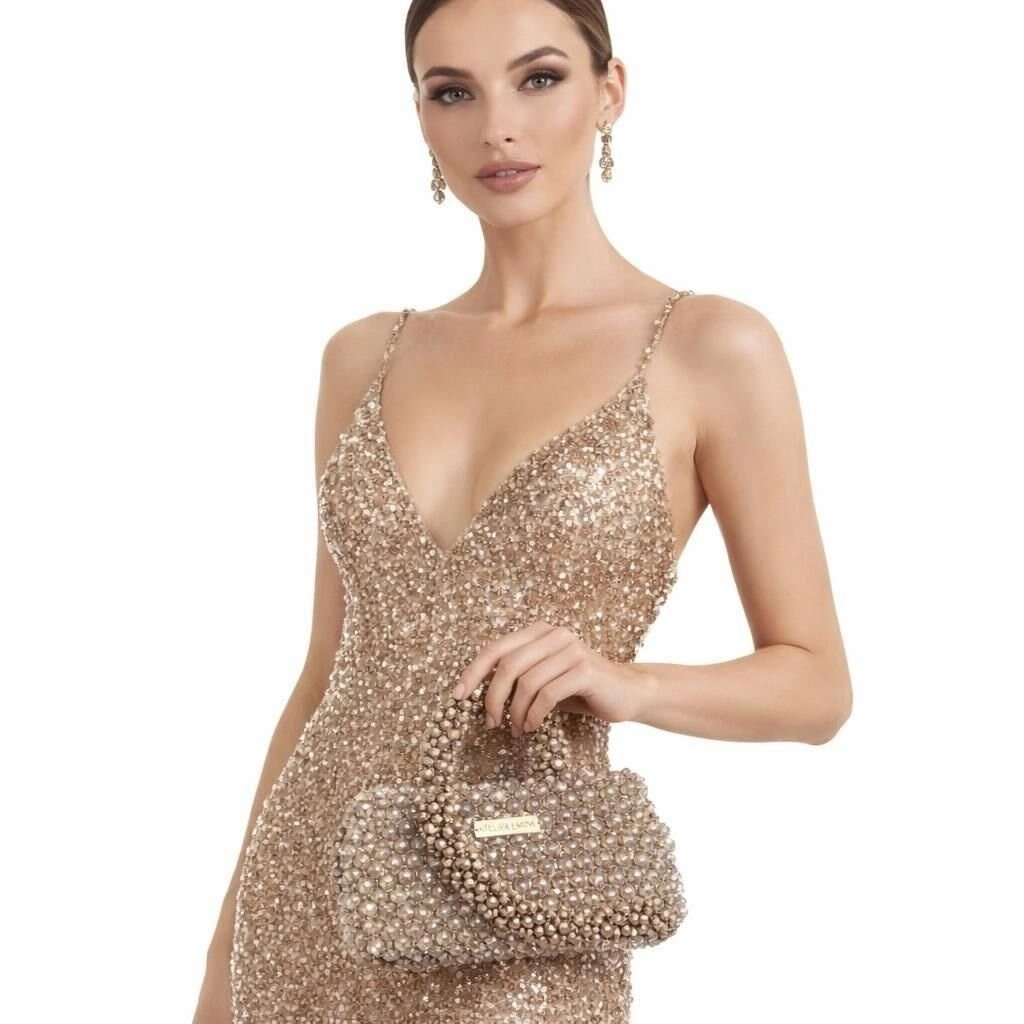 Kristal boncuklar, yüzeyde maksimum ışık kırılımı ve derinlik etkisi elde edilecek şekilde yoğun, modüler ve çok katmanlı bir örgü sistemi ile tek tek işlenmiştir. Gövde, keskin köşelerden arındırılmış ancak net hatlarla tanımlanmış dikdörtgen siluetiyle güçlü bir hacim dengesi sunar.