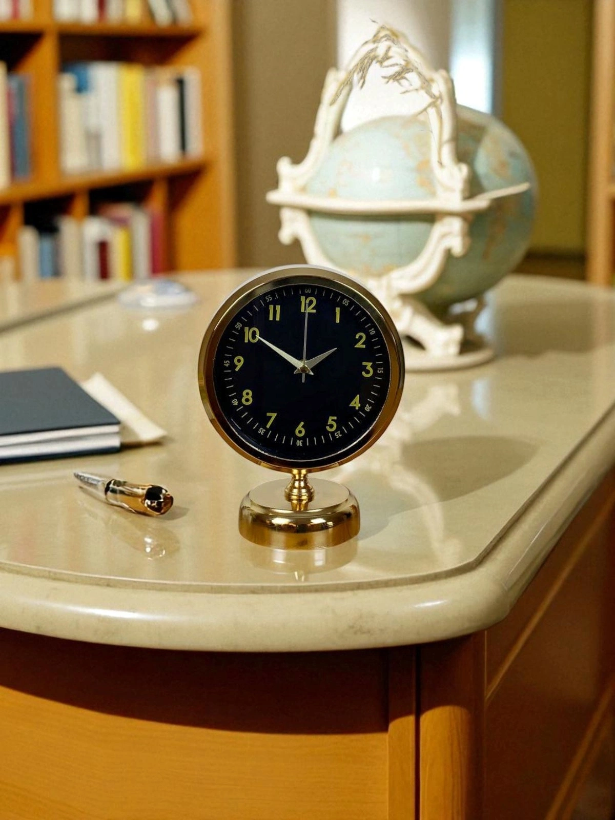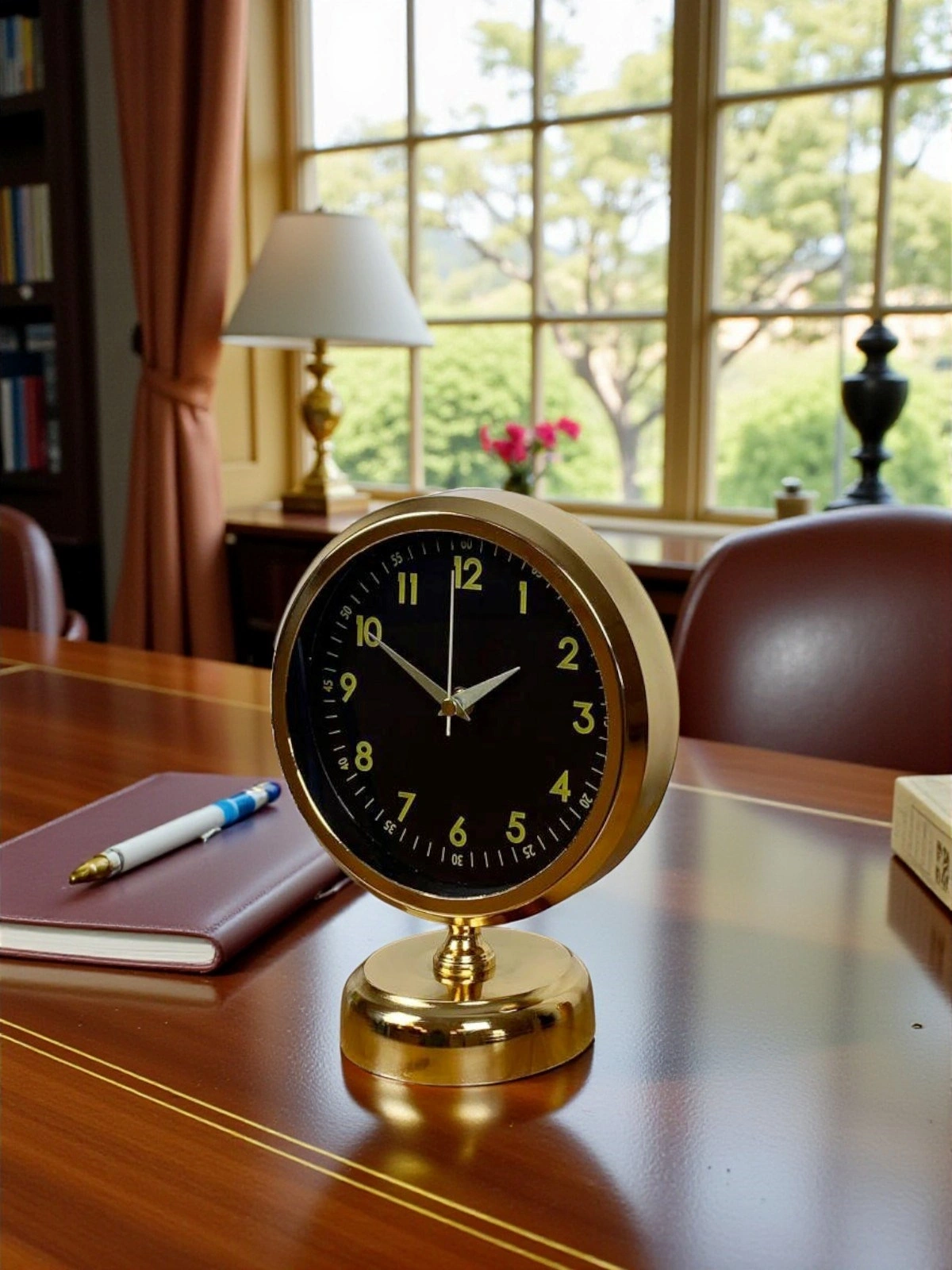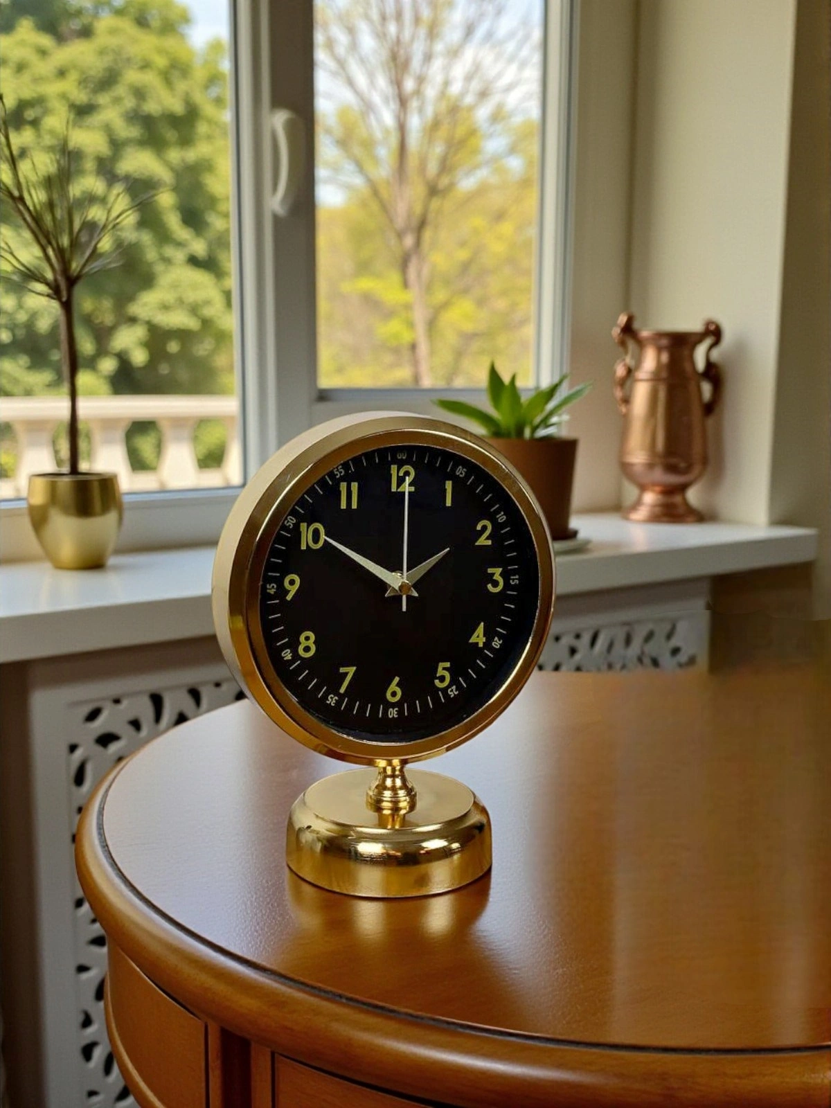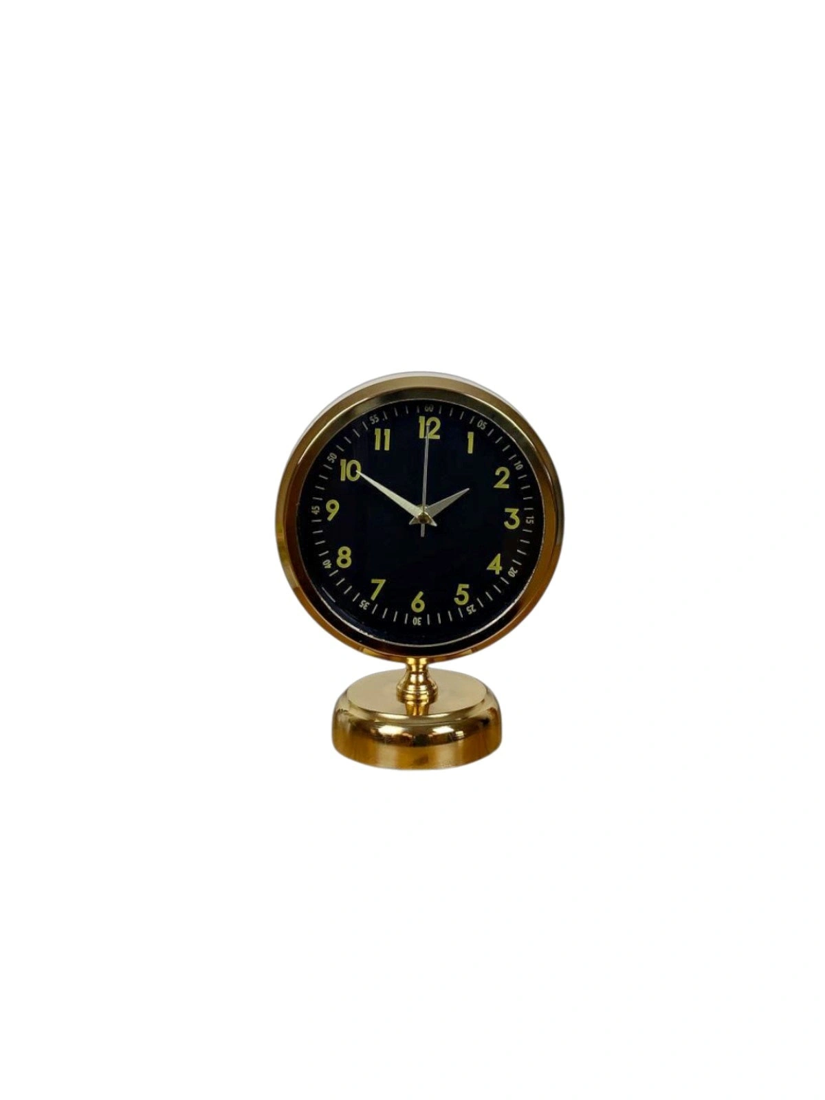 Parlak gold kaplaması ve siyah kadranıyla dikkat çeken bu masa saati, bulunduğu ortama anında şıklık ve prestij kazandırır. Klasik yuvarlak formu, net ve okunaklı rakamlarıyla hem estetik hem de fonksiyonel bir kullanım sunar. Gold gövde ile siyah kadranın kontrastı, modern ve klasik dekorasyon stillerine kusursuz uyum sağlar.