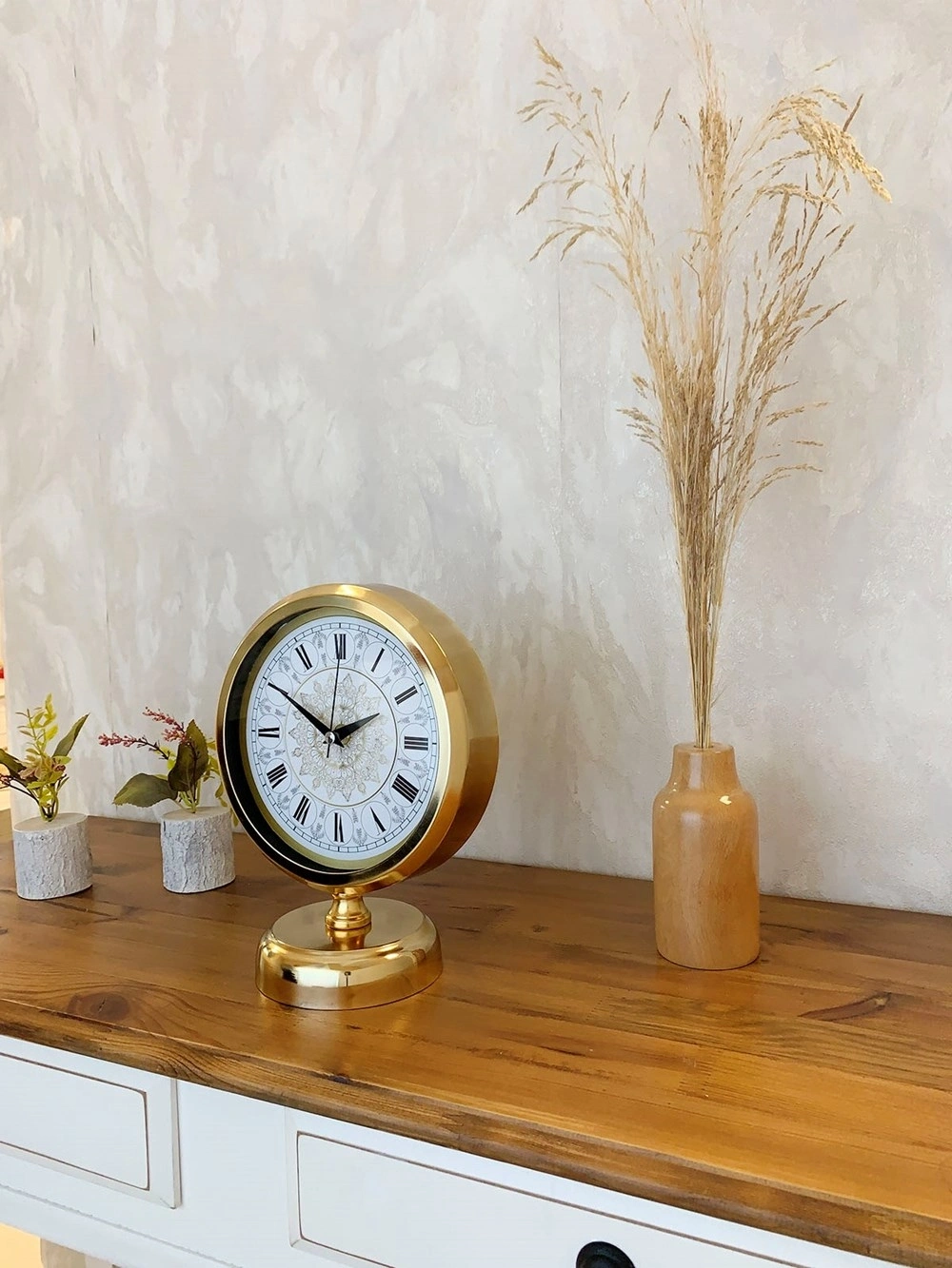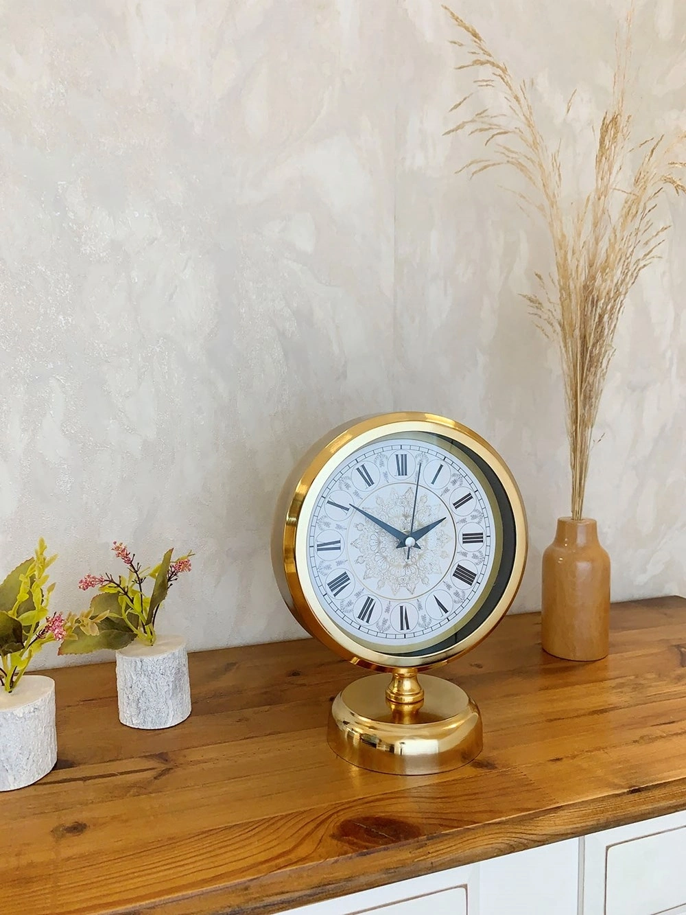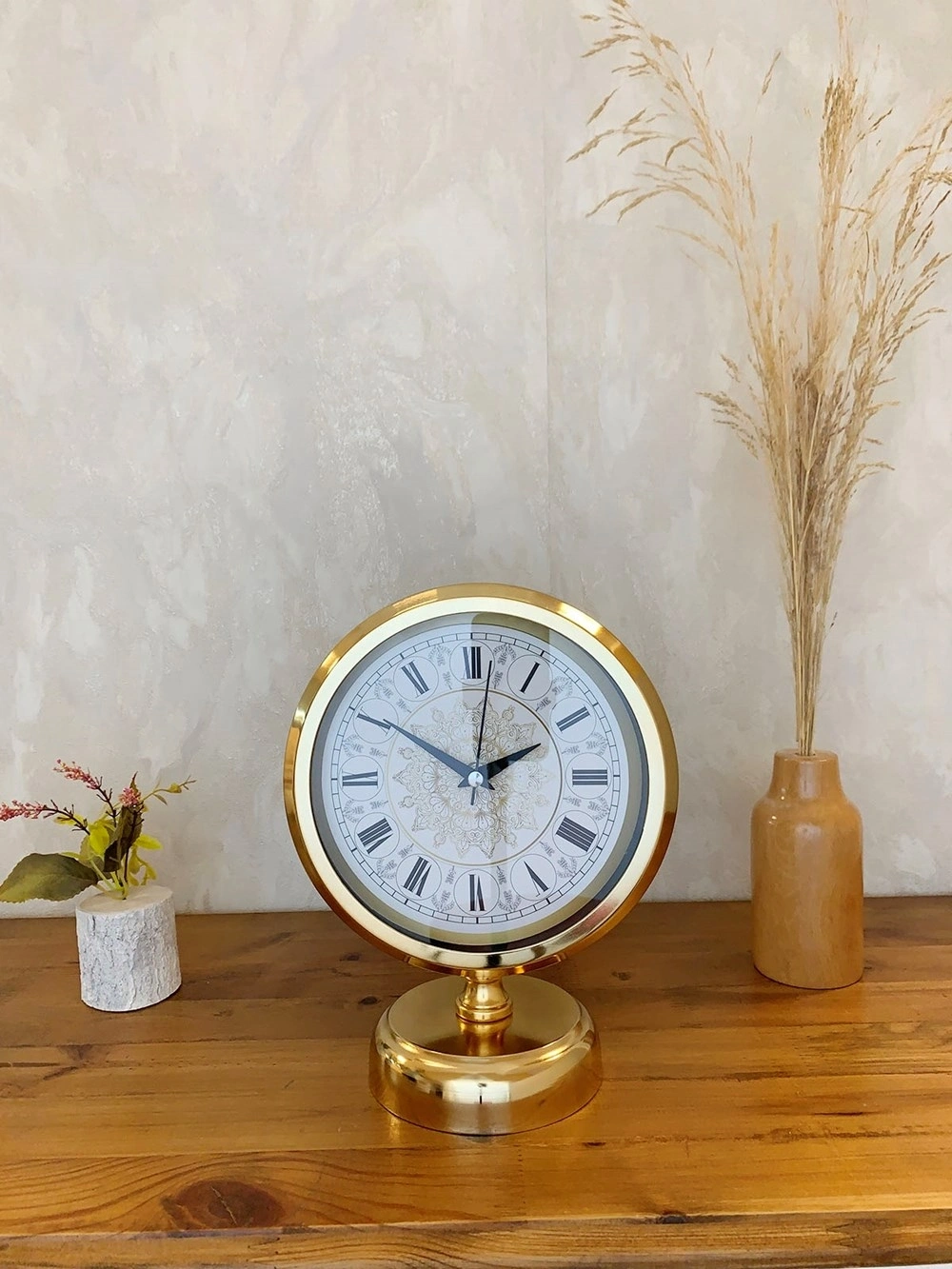Gold Metal Çini Desenli Roma Rakamlı Masa Saati