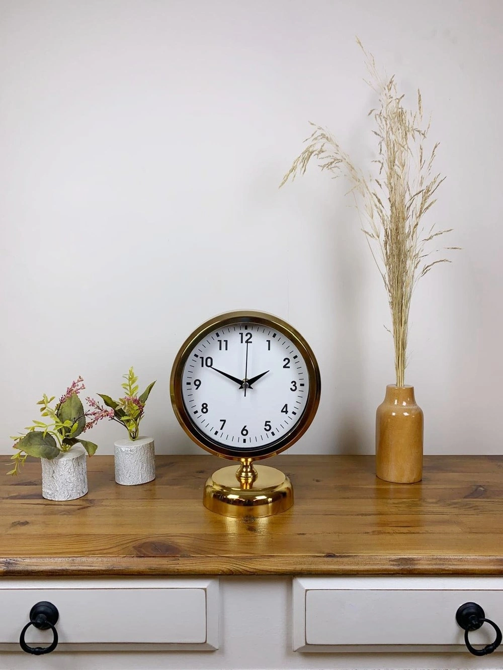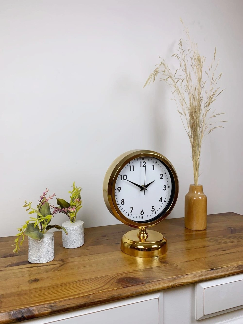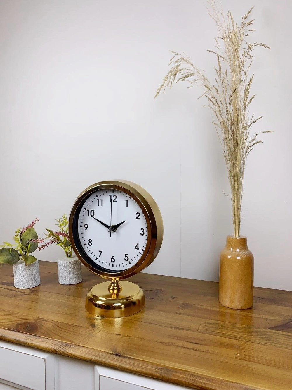 Şık ve modern tasarımıyla dikkat çeken  gold kaplama masa saatimiz, sessiz akar saniye mekanizmasıyla konforlu bir kullanım sunar. Gerçek cam koruma paneli sayesinde uzun ömürlü ve dayanıklıdır. Estetik görünümüyle hem ev hem de iş yerleri için ideal bir dekoratif üründür.