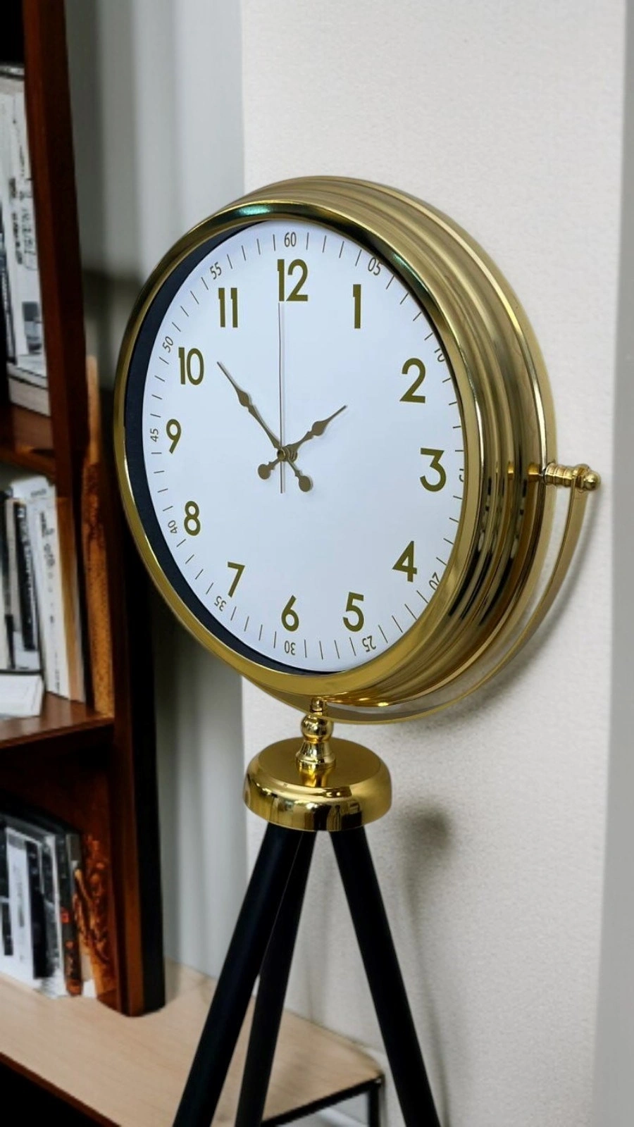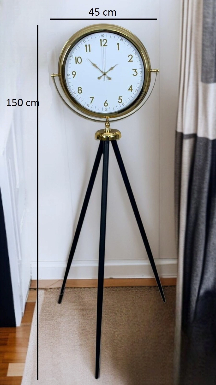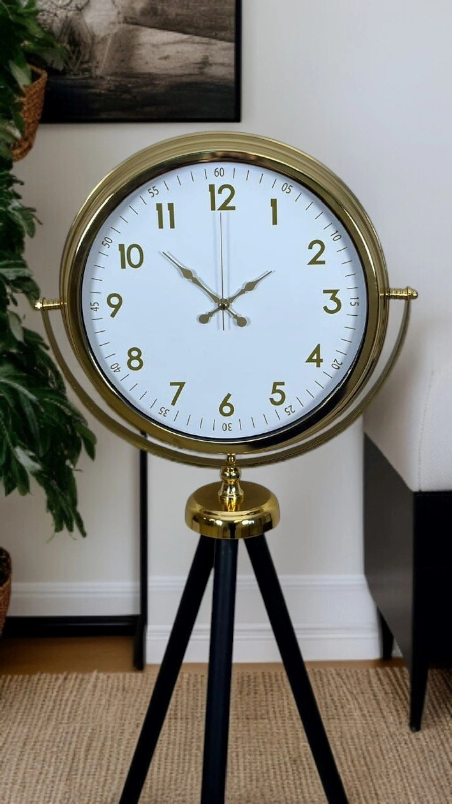 The white dial combined with the gold metal frame offers a fresh, bright, and noble appearance. The black tripod leg structure gives the clock a modern and balanced stance. Thanks to this color harmony, it perfectly fits both classic and modern decoration styles.