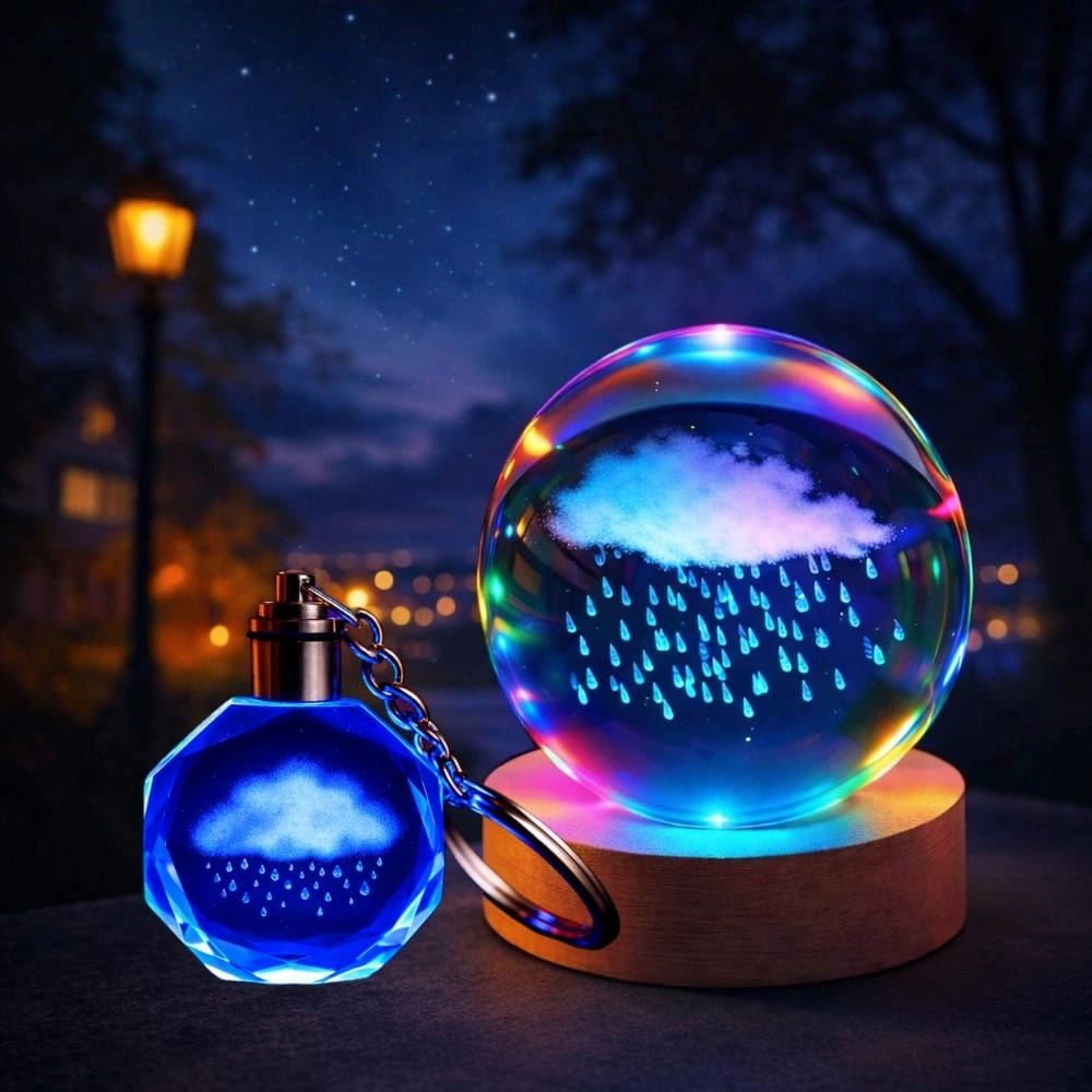 Işıklı Yağmur Bulutu Tasarımlı Cam Küre Ve Kristal Anahtarlık Hediye Seti
