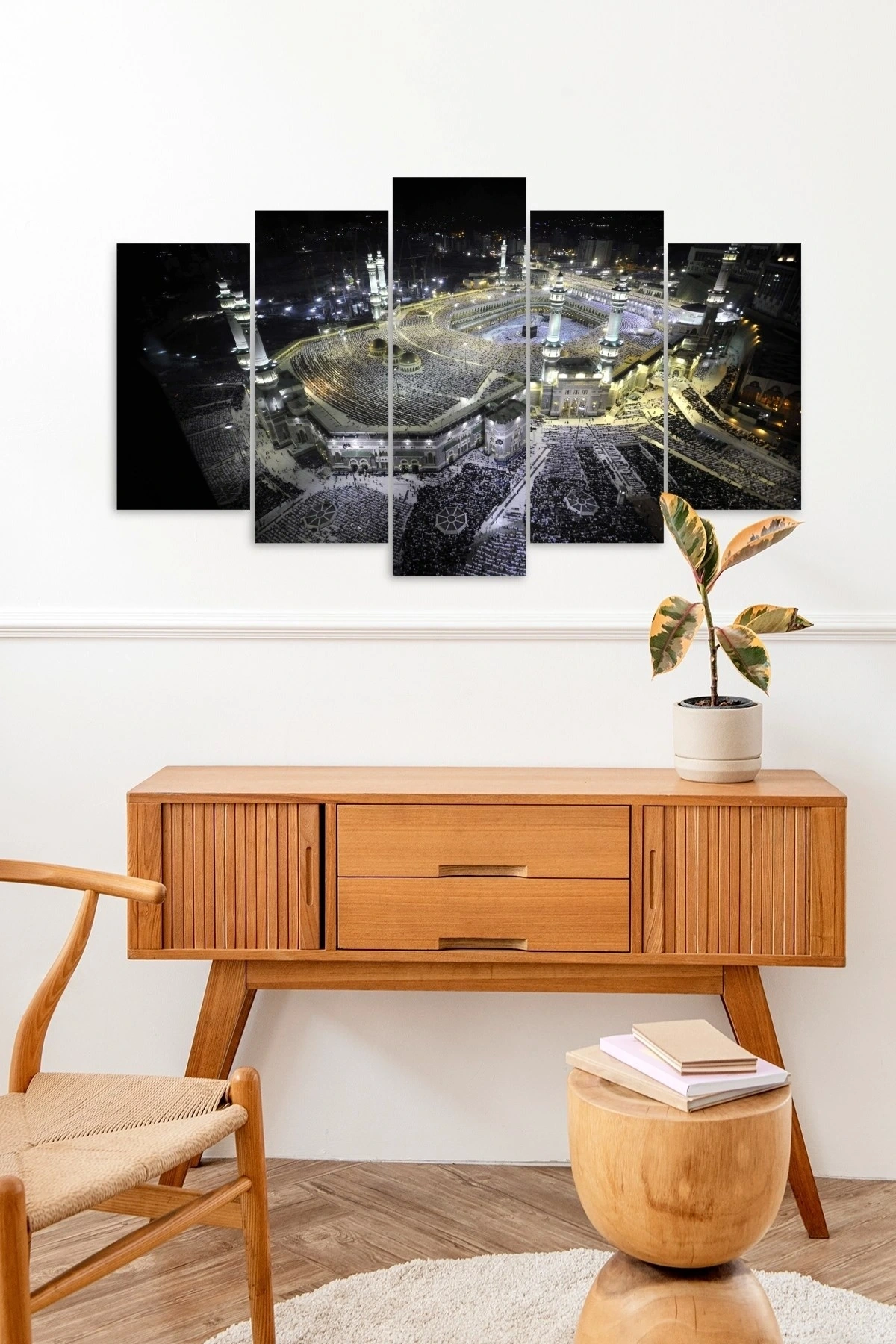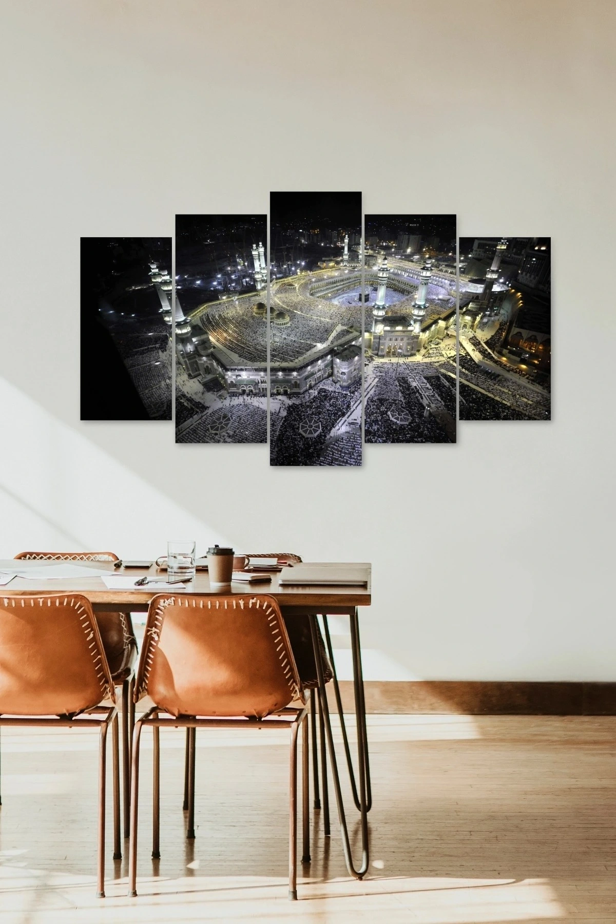 Maneviyat ve dini temalarıyla evinizin dekorasyonuna derinlik katan Kabe manzarası 5 parçalı MDF tablo, duvarlarınıza huzur ve dinginlik getirir; Yüksek kaliteli MDF malzemesi sayesinde uzun ömürlü kullanım sunar ve renklerin canlılığını korur; Beş parçadan oluşan set, farklı boyutlardaki parçalarla mekanınıza uyum sağlar ve estetik bir bütünlük oluşturur; Kabe manzarası temalı bu tablo, manevi değerlerinizi yansıtan bir dekoratif unsur olarak evinizin atmosferini zenginleştirir;