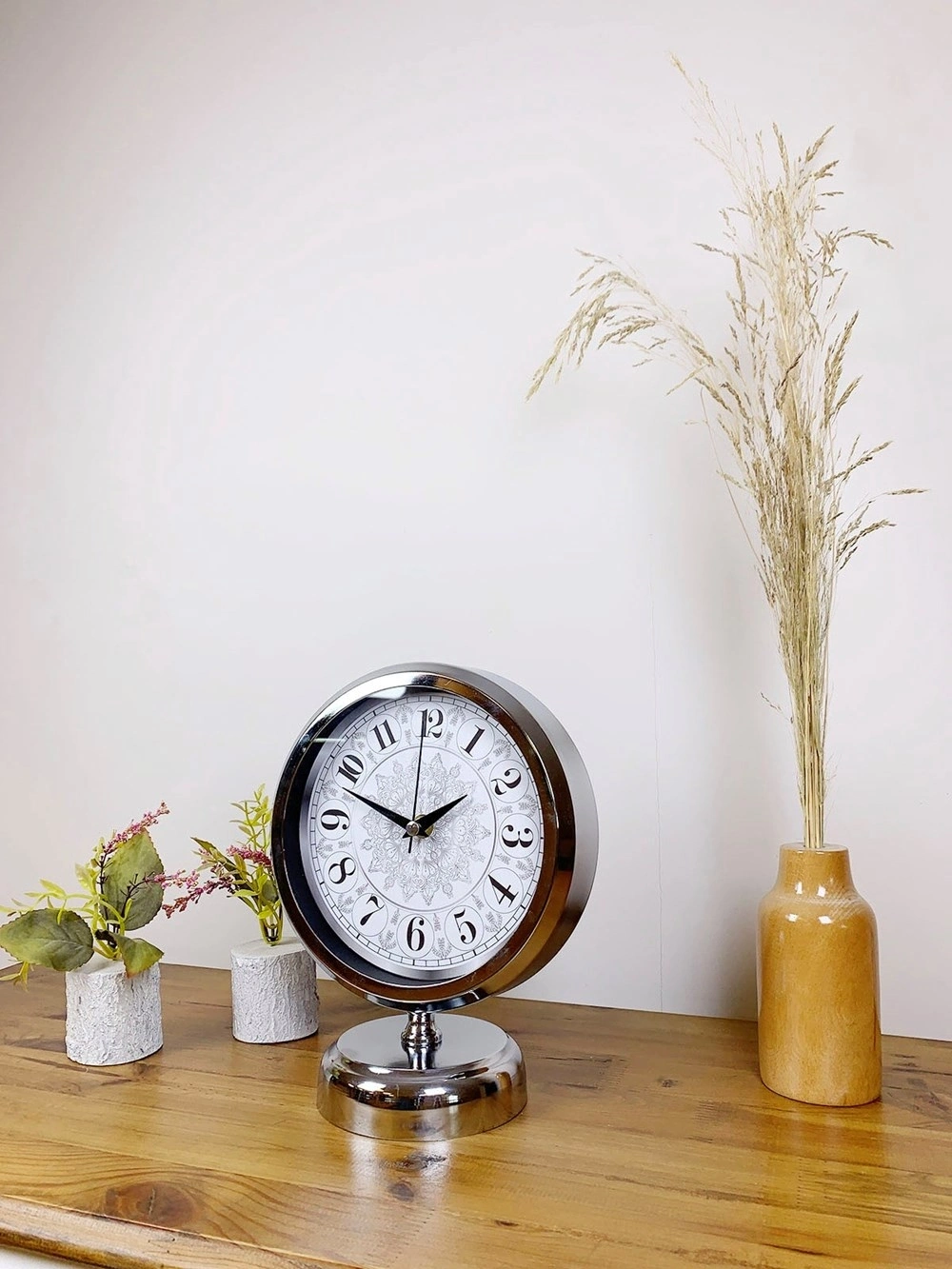 Şık ve modern tasarımıyla dikkat çeken  krom kaplama masa saatimiz, sessiz akar saniye mekanizmasıyla konforlu bir kullanım sunar. Gerçek cam koruma paneli sayesinde uzun ömürlü ve dayanıklıdır. Estetik görünümüyle hem ev hem de iş yerleri için ideal bir dekoratif üründür.