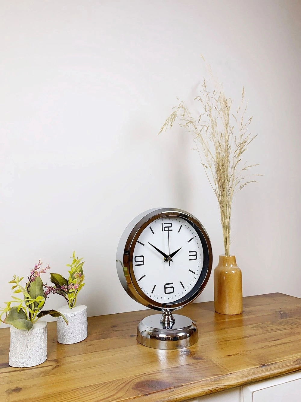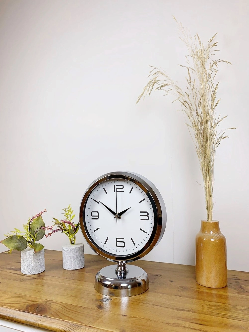 Şık ve modern tasarımıyla dikkat çeken  krom kaplama masa saatimiz, sessiz akar saniye mekanizmasıyla konforlu bir kullanım sunar. Gerçek cam koruma paneli sayesinde uzun ömürlü ve dayanıklıdır. Estetik görünümüyle hem ev hem de iş yerleri için ideal bir dekoratif üründür.
