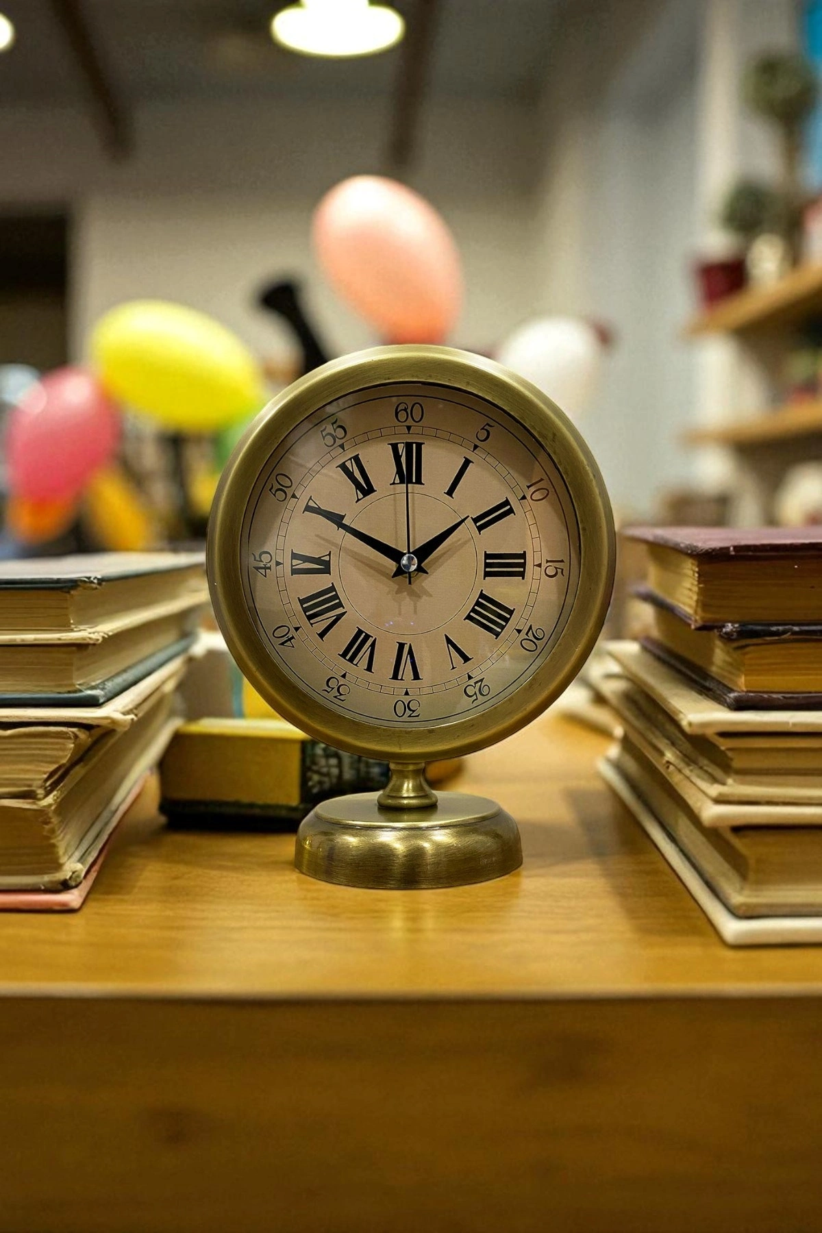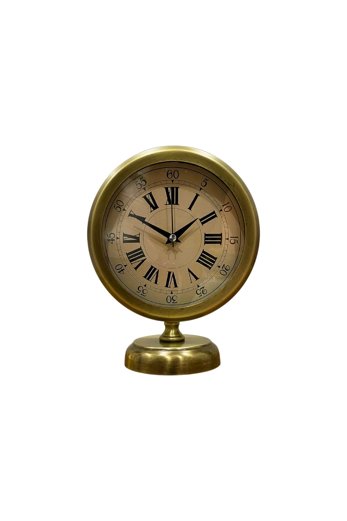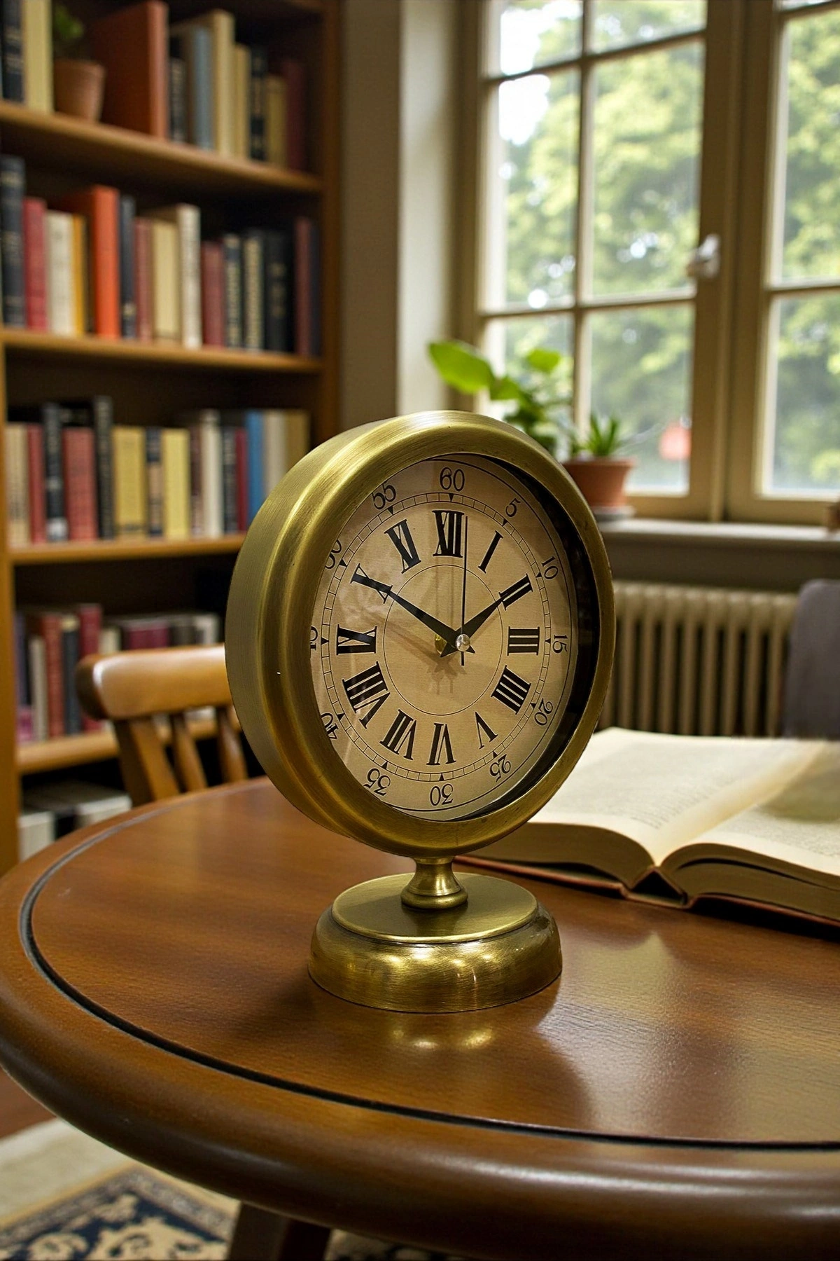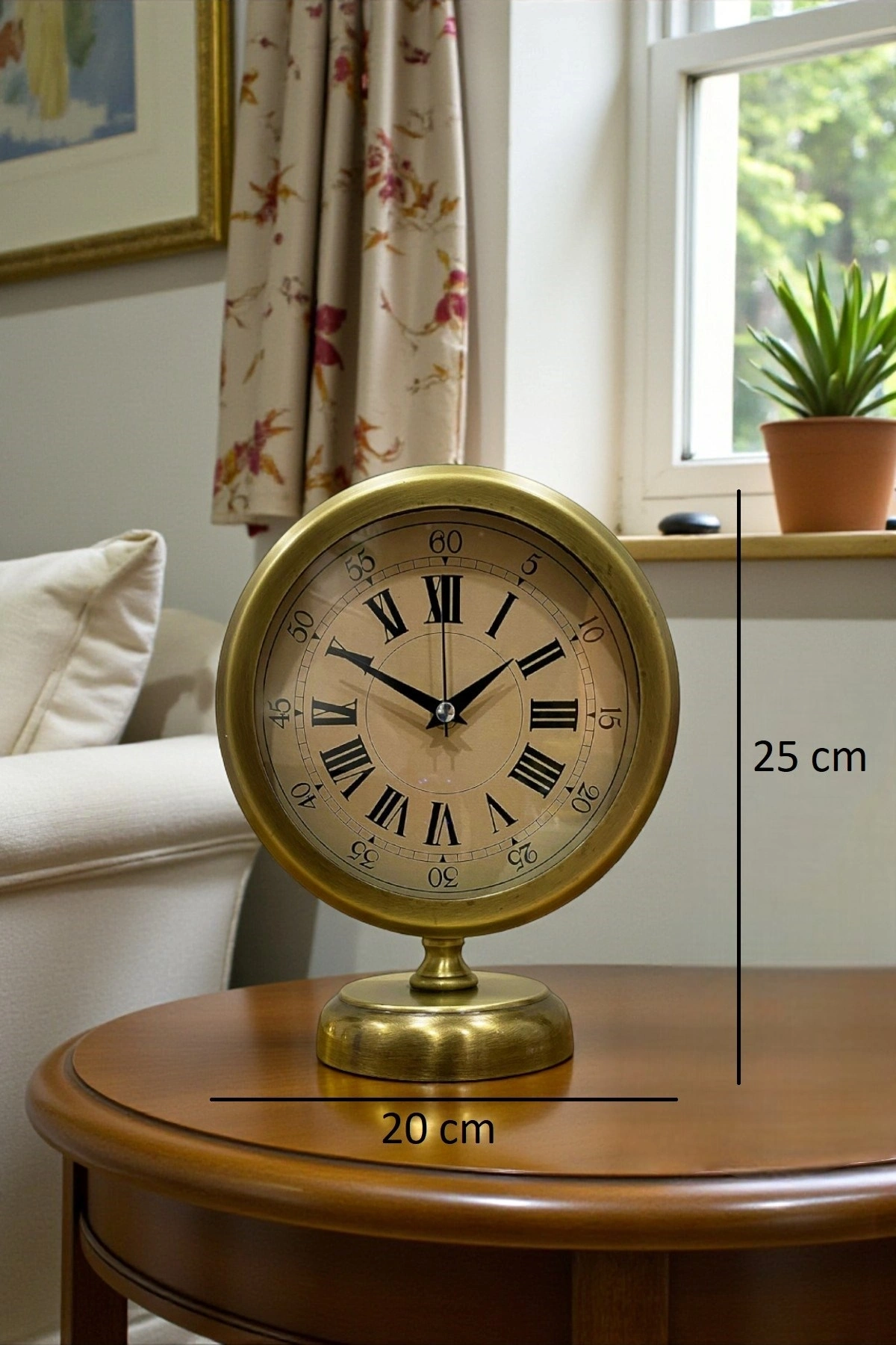 One of the most elegant examples of classic clock design, this antiqued vintage table clock offers timeless elegance with its Roman numeral dial and brass-toned metal body. This model, which combines nostalgic details with modern living spaces, creates a strong and noble decorative impact in its environment.