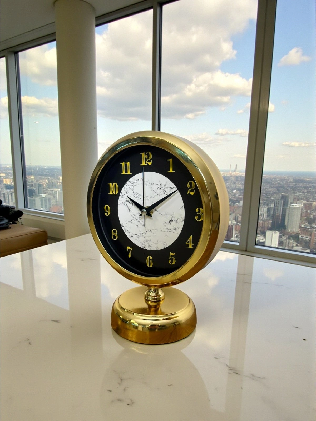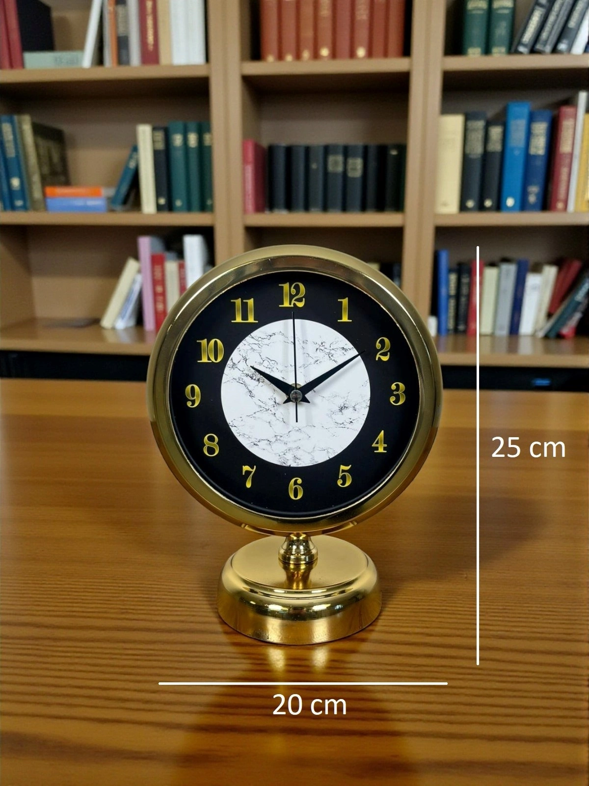Designed for those looking for both a modern and sophisticated effect in their decor, this gold table clock instantly adds a touch of luxury to any space with its gold numbers on a black background and elegant marble-patterned detail in the center. The gold body reflects light gracefully, and the marble texture adds a premium character to the clock design.
