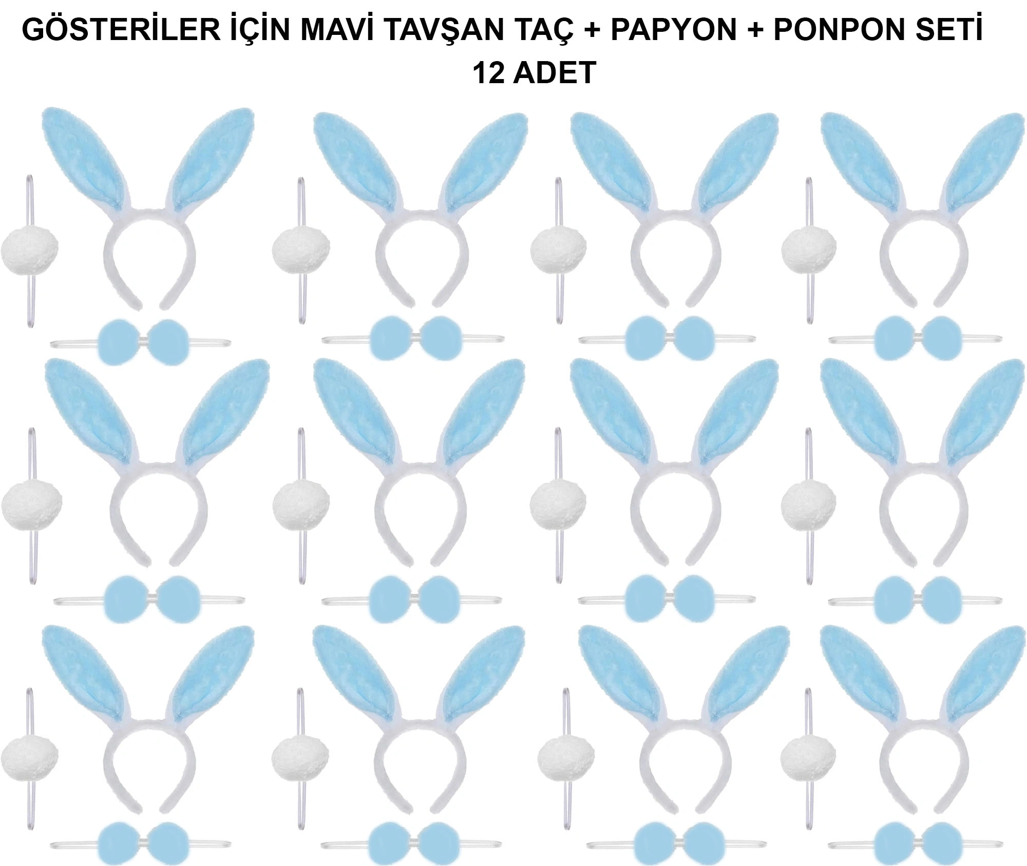 Mavi Tavşan Kostüm Seti – Taç, Papyon, Ponpon (12’li Paket) (5365)