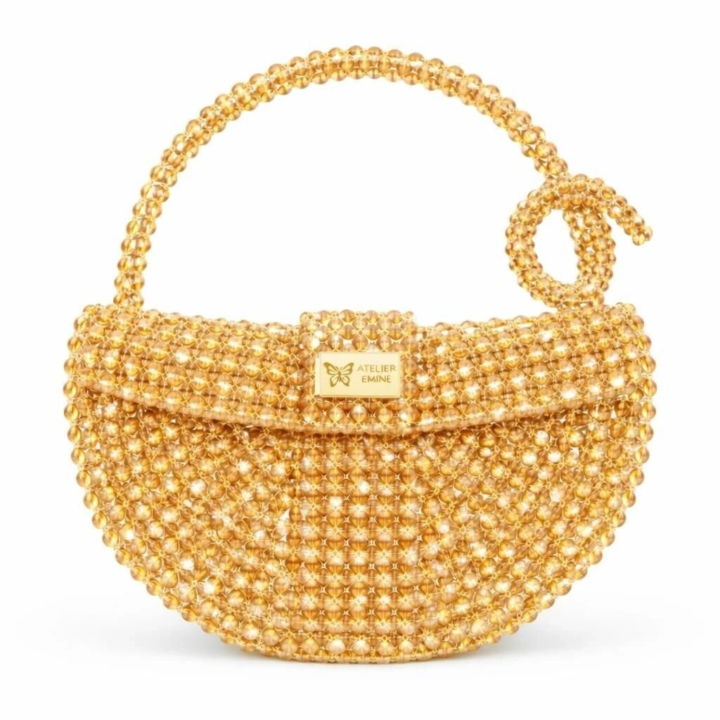Atelier Emine’in Crystal Gelato Couture serisine ait Melo Caramello, 8 mm optik sınıfı kristal boncukların yüksek dayanımlı misina ile örülmesiyle tamamen el işçiliğiyle üretilmiş, yarım ay formunda premium mini çanta modelidir.