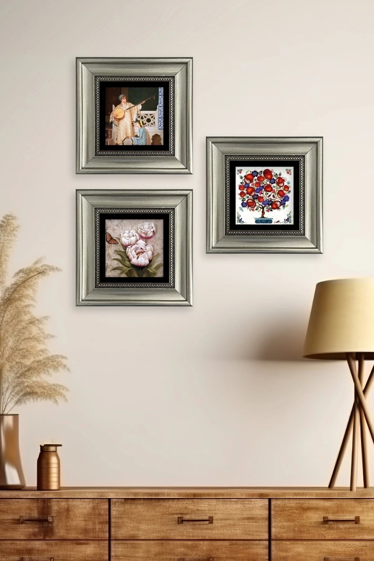 Ürün hakkında: Her Tablonun Ölçüleri: 20 cm x 20 cm veya 30 cm x 30 dir. ; Kalınlık :2,5 cm'dir. ; Ürünün arka tarafında askı aparatı bulunmaktadır. ; Kullanılan çerçeveler yüksek kaliteli, eskitme görünümlü kompozit malzemeden üretilmiştir. ; Taşların yüzeyindeki baskı teknolojisi özel olup sağlığa hiçbir zararı yoktur. ; Kullanılan malzeme dağdan çıkan gerçek taş oldugu için yüzeyinde belli oranda gözenek bulunması ve renginin krem renginin tonlarını barındırması normaldir kimyasal malzeme teması Yüzey deformasyona maruz kalabilir. ; Nemli bezle silinerek temizlenebilir. ; Isıya, suya ve neme dayanıklıdır. ; Kutu içeriği: Orijinal kutu içerisinde 3 adet çerçeveli taş duvar dekoru. ; 3 adet çerçeveli duvar dekoru ağırlığı: 750 gr çerçeve askısı ile duvara montajı yapılabilir.;