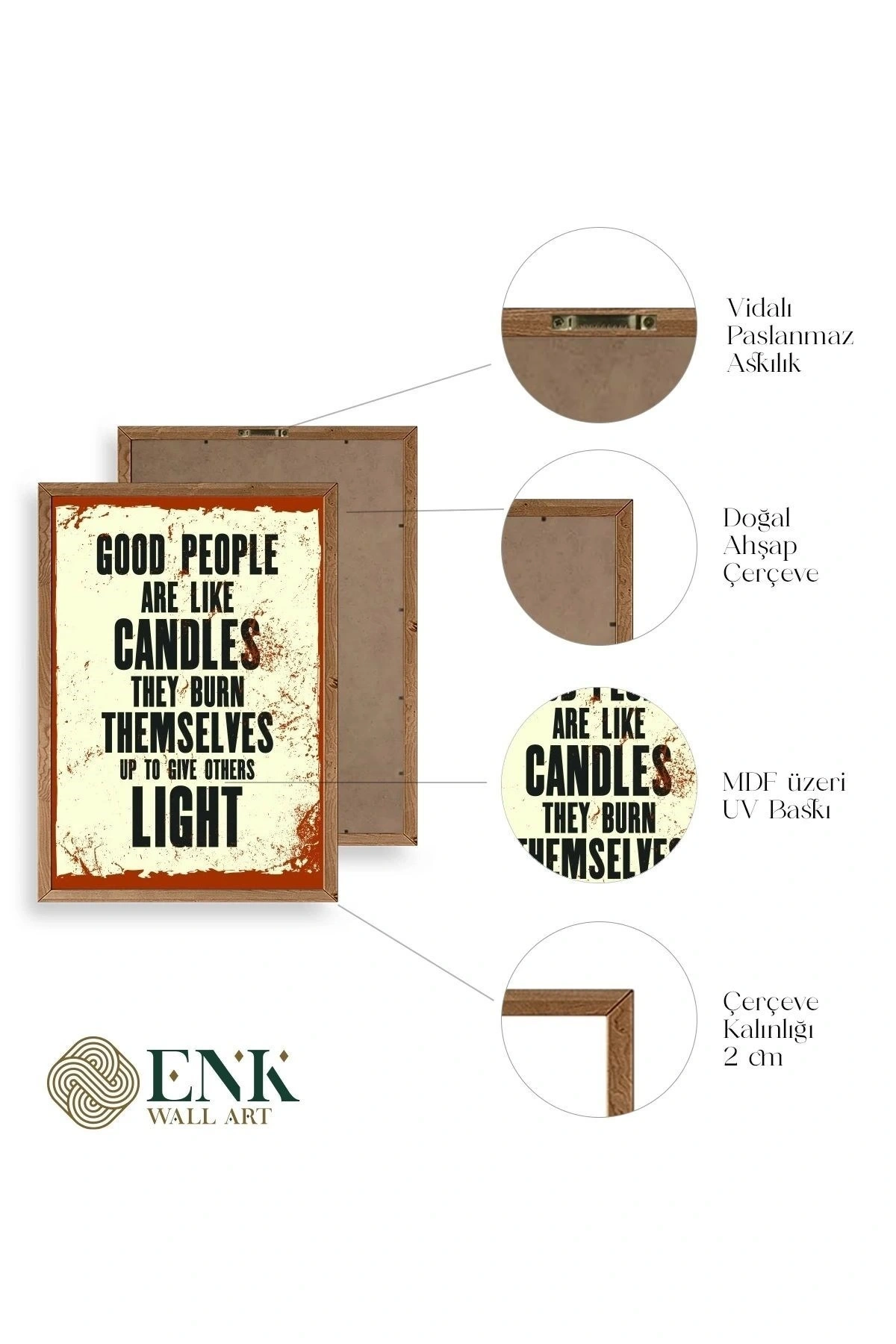 Tablolarımız gerçek ahşap çerçevelidir, çerçeve görünümlü değildir. ; ENK Wall Art Olarak Ahşap Çerçeveli Tablolar Üretiyoruz. ; Tablolarımız tek parça, 3 Parça, 5 Parça ve daha çok kategoride tasarımcılarımız tarafından ev ve ofisleriniz duvarları süslemek için tasarlanmaktadır. ; Ahşap Çerçeveli Duvar Tabloları ile yaşam alanlarınıza yepyeni bir görünüm kazandırın. ; Yıllarca dayanacağından emin olduğumuz sağlam çerçevelere sahip yüksek kaliteli ahşaptan üretilmiştir. ; İster bir köşeyi süslemek isteyin, ister evinizi yenilemek , bu ahşap tablolar herhangi bir yaşam alanına stil ve işlev getirecektir. ; Duvara kolay bir şekilde monte edilir. ; Uzun ömürlü kullanım için sağlam ahşap çerçeveden yapılmış, dayanıklı ve güçlü. ; Duvara monte edilebilir tasarımı, yaşam alanlarında veya yatak odalarında duvara kolayca asılmasını sağlar. ; Pürüzsüz üst yüzeyi temiz kalmayı kolaylaştırır. ; Herhangi bir stile uyacak şekilde çeşitli renklerde gelir. ; Kolay yeniden düzenleme için hafif ve portatif. ; Küçük oturma odaları veya dar alanlar için mükemmel boyut. ; Eve taşınma hediyesi olarak idealdir. ; Herhangi bir evin dekorunu süslemek için harika bir yol. ; Herhangi bir modern veya çağdaş iç tasarıma mükemmel bir katkı. ; Tablo içi 3 mm mdf (ahşap) malzeme üzeri uv baskıdır. ; Renkler canlı ve solma yapmaz. ; Kırılma, bükülme ve çizilmeye karşı dayanıklıdır.;