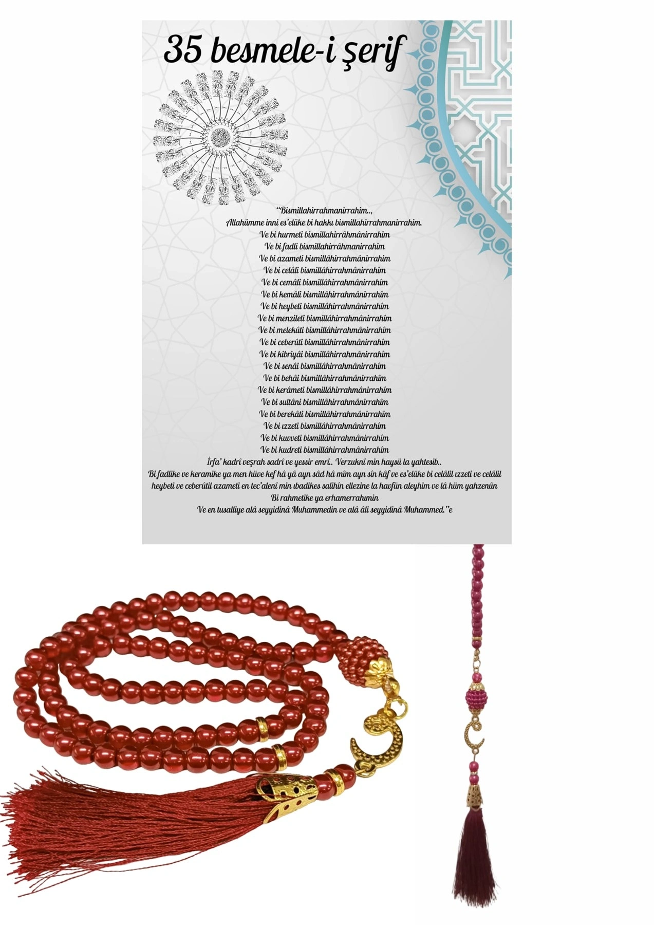 Namaz Tesbihi Vavlı 99'lu Cam İncili 35 Besmele-i Şerif Dua Kartı İle Fuşya Renk Hediyelik