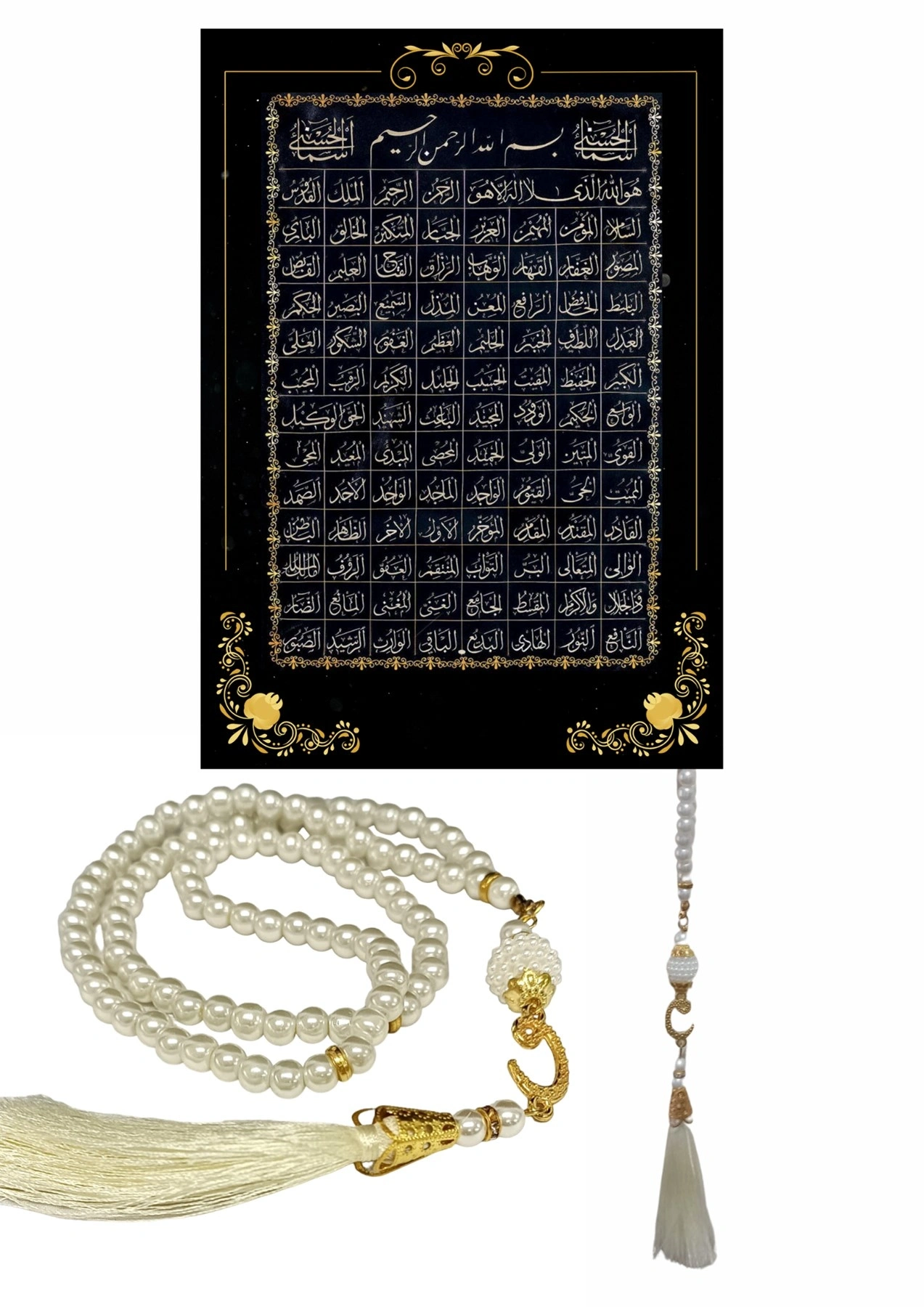 Namaz Tesbihi Vavlı 99'lu Cam İncili Esma'ul Hüsna Dua Kartı İle Krem Renk Hediyelik