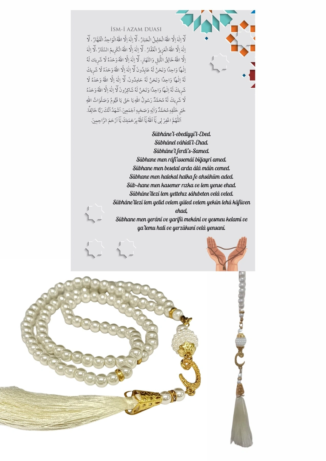 Namaz Tesbihi Vavlı 99'lu Cam İncili İsmi Azam Dua Kartı İle Krem Renk Hediyelik