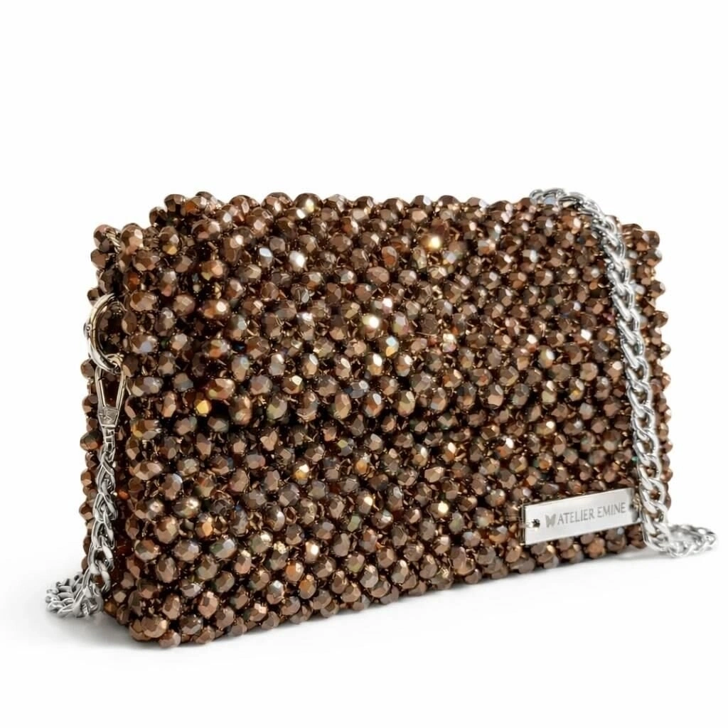 Atelier Emine’in Crystal Gelato Couture koleksiyonuna ait Panna Fondente, 8 mm optik sınıfı kristal boncukların yüksek dayanımlı misina ile tek tek örülmesiyle üretilmiş, dikdörtgen formlu premium mini çanta modelidir.
