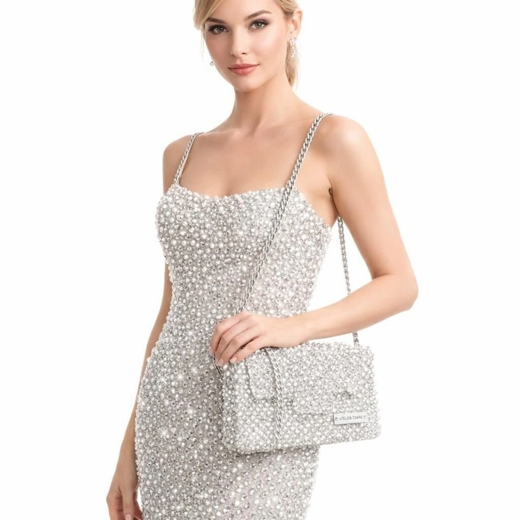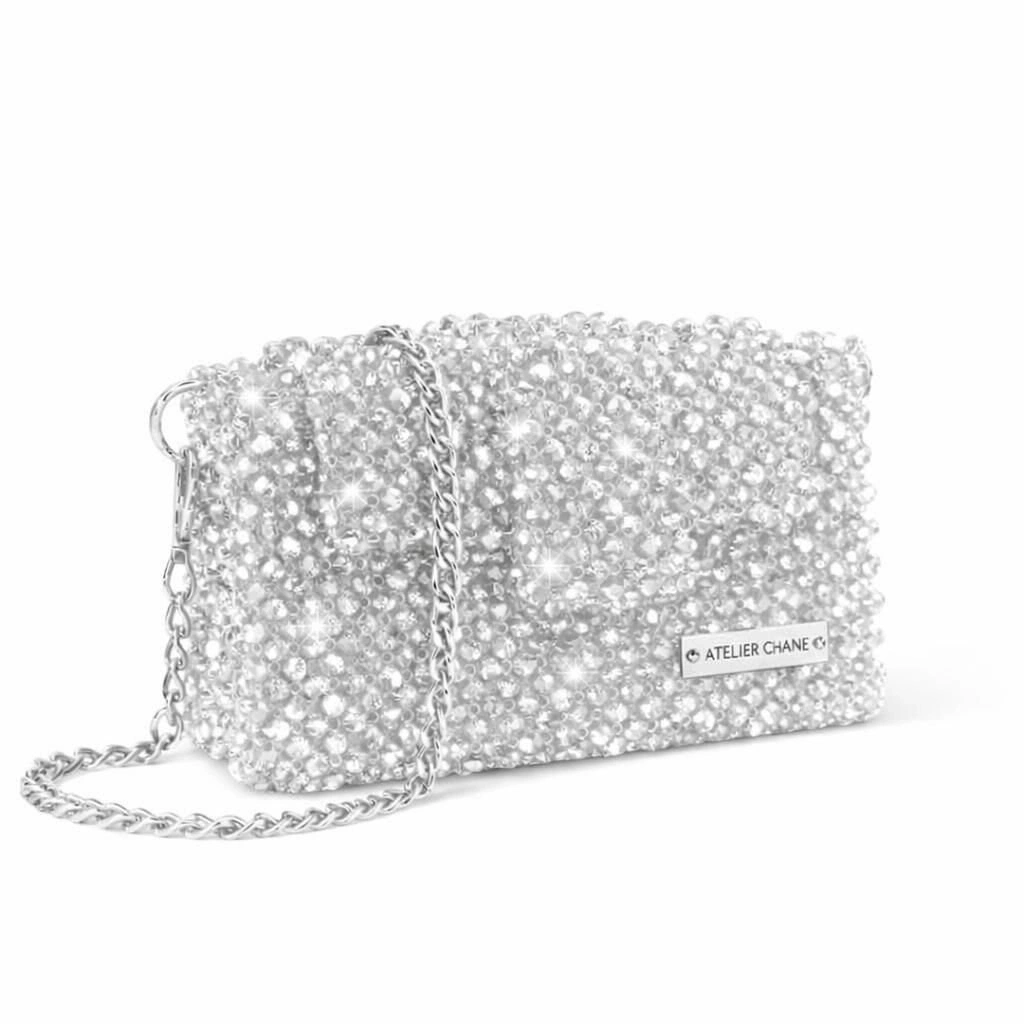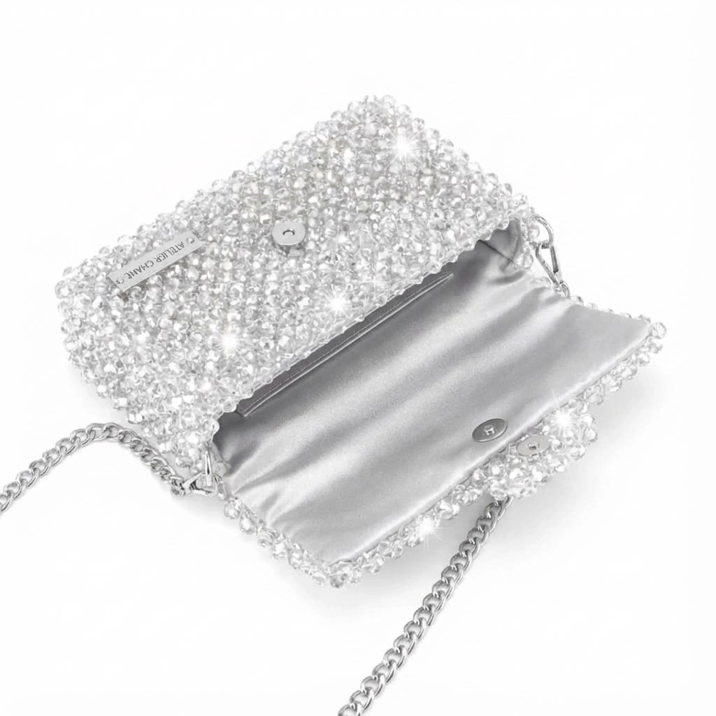 Atelier Emine’in Crystal Gelato Couture serisine ait Panna Porcelain, 8 mm optik sınıfı kristal boncuklar, metal omuz zinciri ve saten astar kullanılarak tamamen el işçiliğiyle üretilmiş premium clutch modelidir.