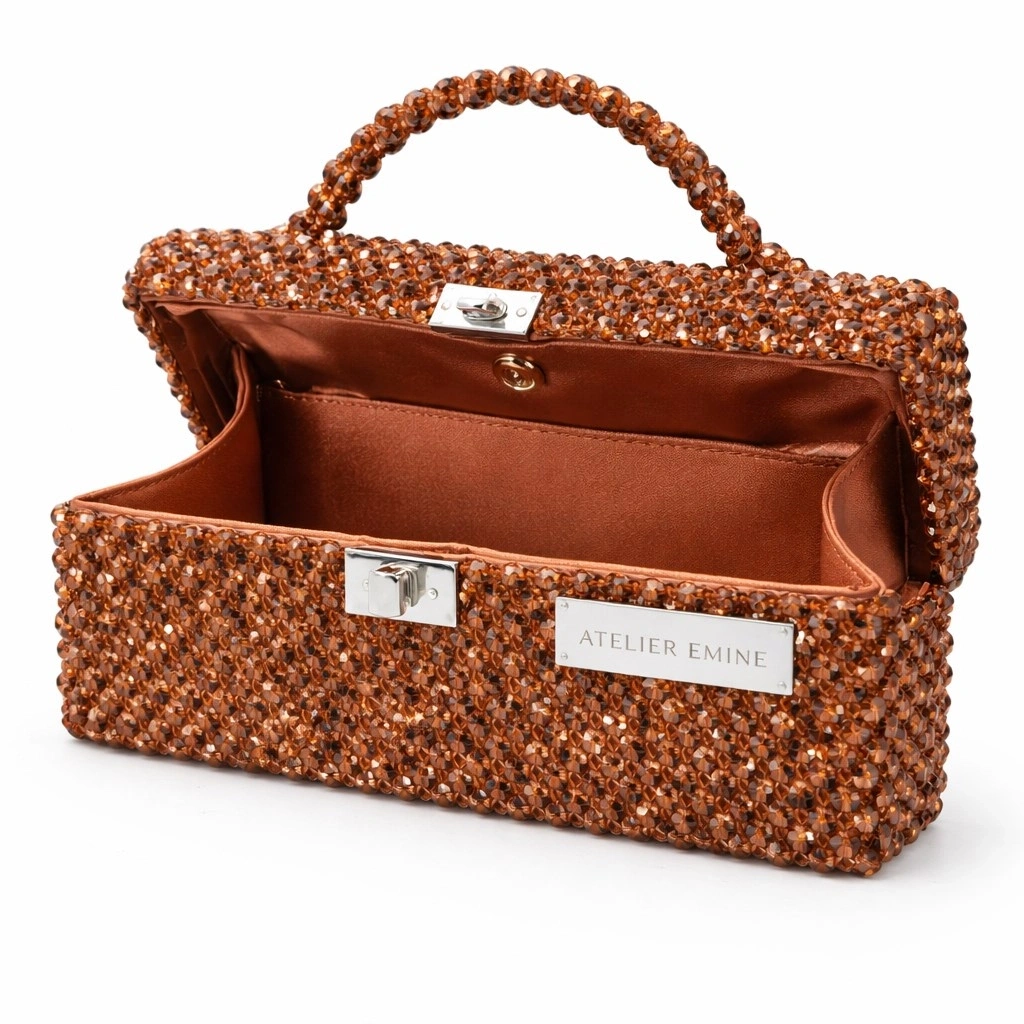 Atelier Emine’in Crystal Gelato Couture serisine ait Panna Terra, 8 mm optik sınıfı kristal boncuklar, üst taşıma kulpu, metal kilit mekanizması ve saten astar kullanılarak tamamen el işçiliğiyle üretilmiş premium top-handle clutch modelidir.