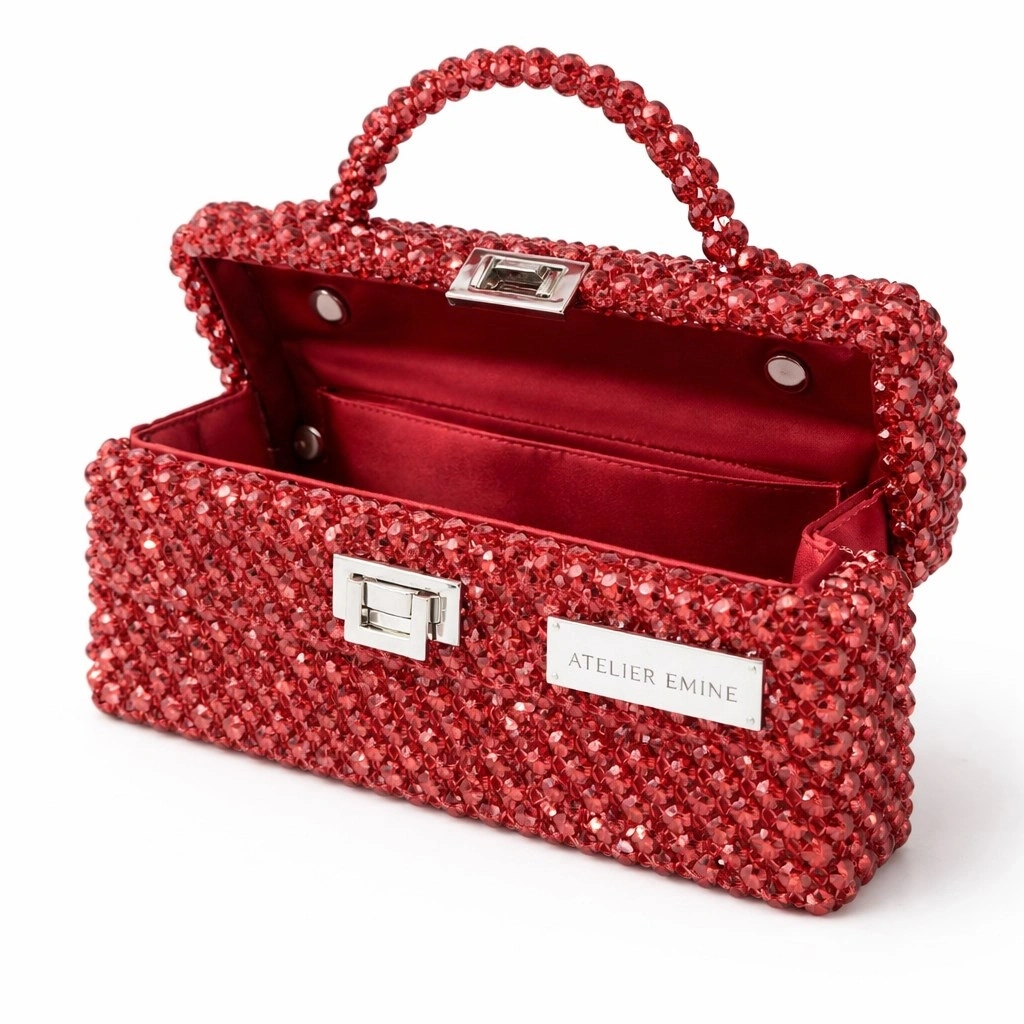 Atelier Emine’in Crystal Gelato Couture serisine ait Panna Wine, 8 mm optik sınıfı kristal boncuklar, üst taşıma kulpu, metal kilit mekanizması ve saten astar kullanılarak tamamen el işçiliğiyle üretilmiş premium top-handle clutch modelidir.