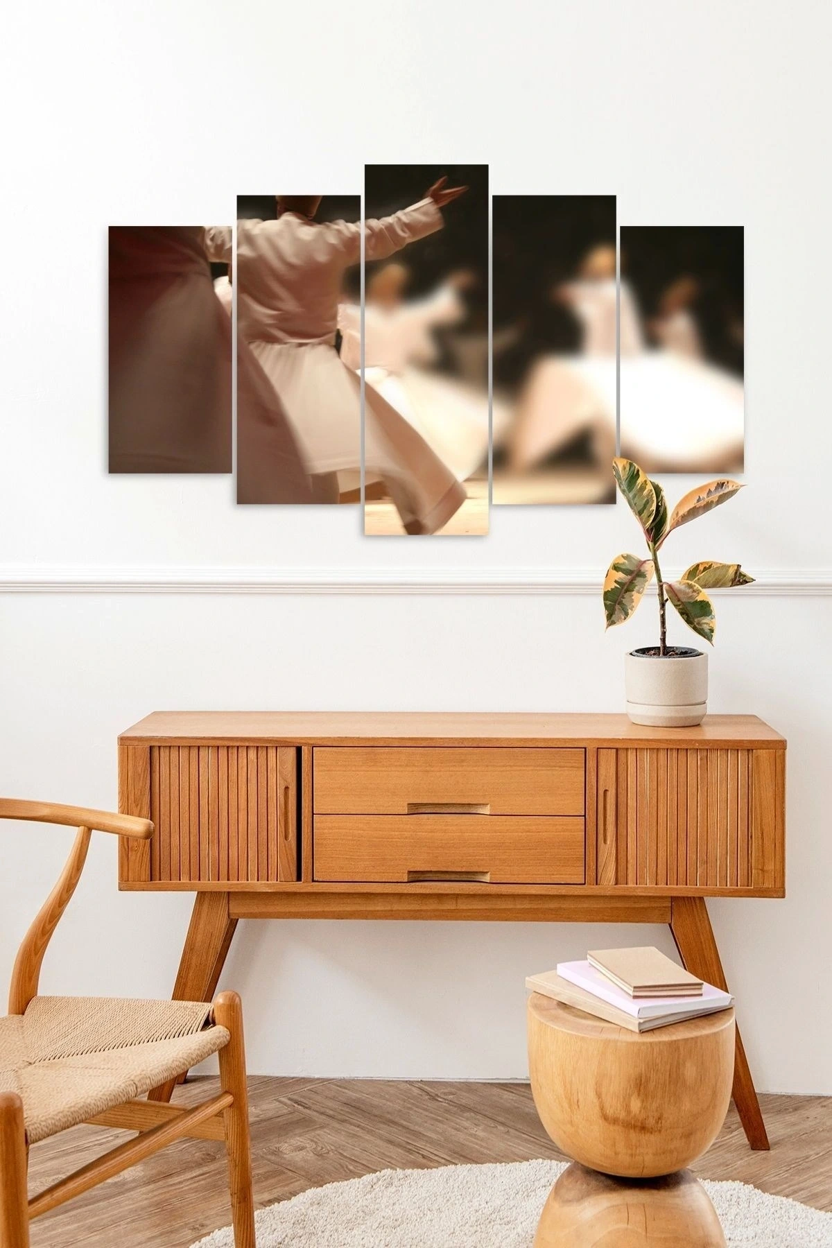 Modern dekorasyon anlayışınıza uyum sağlayacak, ahşap malzeme kullanılarak üretilmiş 5 parçalı Semazen manzara tablosu; Ev veya ofisinizde huzur ve dinginlik hissi yaratmak için ideal, estetik ve fonksiyonel bir tasarım; Her bir parçada detaylı işçilikle işlenmiş, doğal ahşap dokusuyla mekanınıza sıcaklık ve şıklık katan bir sanat eseri; Modern stil sahibi olan bu tablo, çağdaş yaşam alanlarınıza kolayca uyum sağlayacak şekilde tasarlanmıştır;