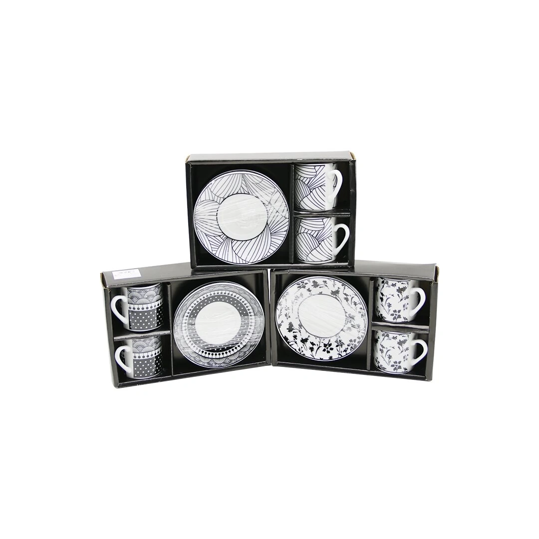 SİYAH - BEYAZ 4PCS=2-TAKIM PORSELEN KAHVE FİNCANI ÇİÇEK - ÇİZGİ - NOKTA MİX DESEN (5365)