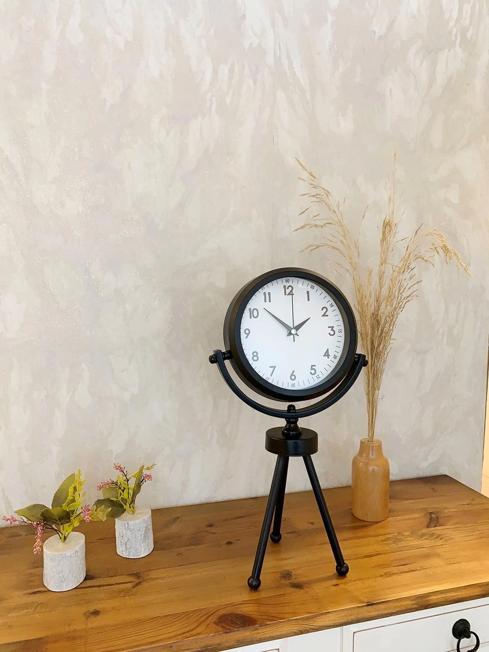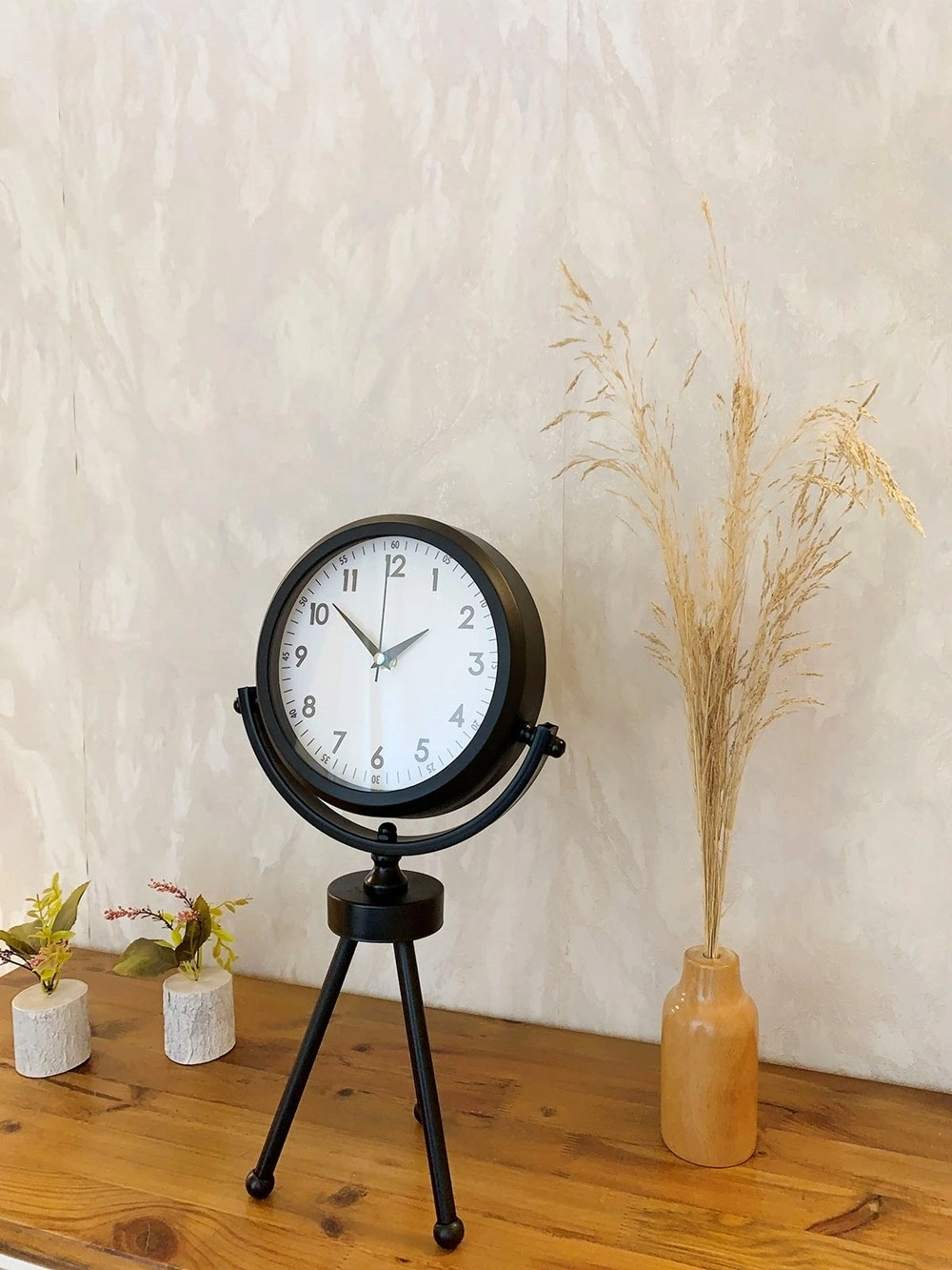 Şık ve modern tasarımıyla dikkat çeken  siyah fırın boyalı  mini tripod masa saatimiz, sessiz akar saniye mekanizmasıyla konforlu bir kullanım sunar. Gerçek cam koruma paneli sayesinde uzun ömürlü ve dayanıklıdır. Estetik görünümüyle hem ev hem de iş yerleri için ideal bir dekoratif üründür.