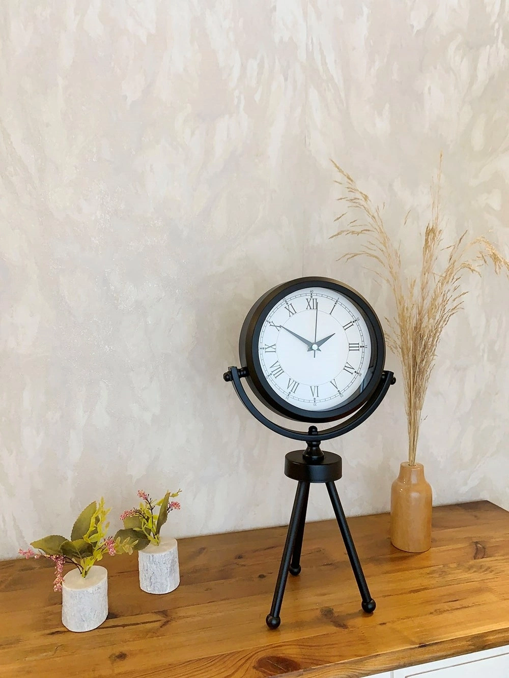Şık ve modern tasarımıyla dikkat çeken  siyah fırın boyalı  mini tripod masa saatimiz, sessiz akar saniye mekanizmasıyla konforlu bir kullanım sunar. Gerçek cam koruma paneli sayesinde uzun ömürlü ve dayanıklıdır. Estetik görünümüyle hem ev hem de iş yerleri için ideal bir dekoratif üründür.