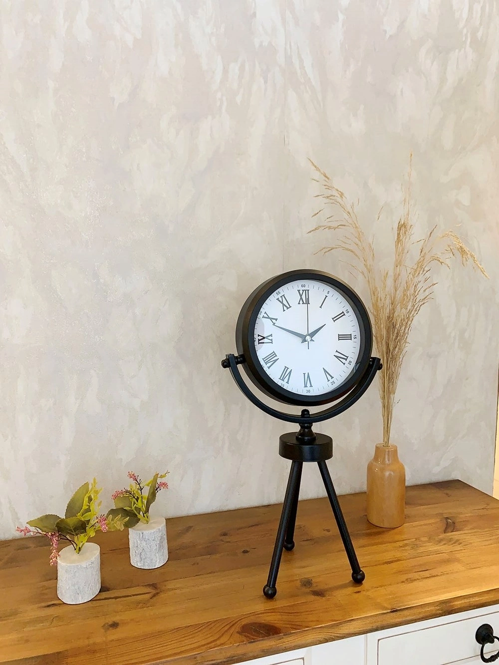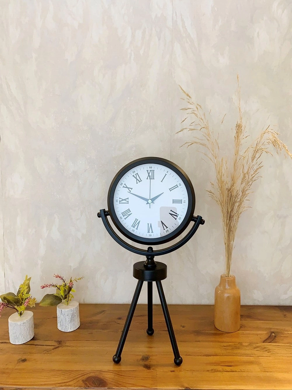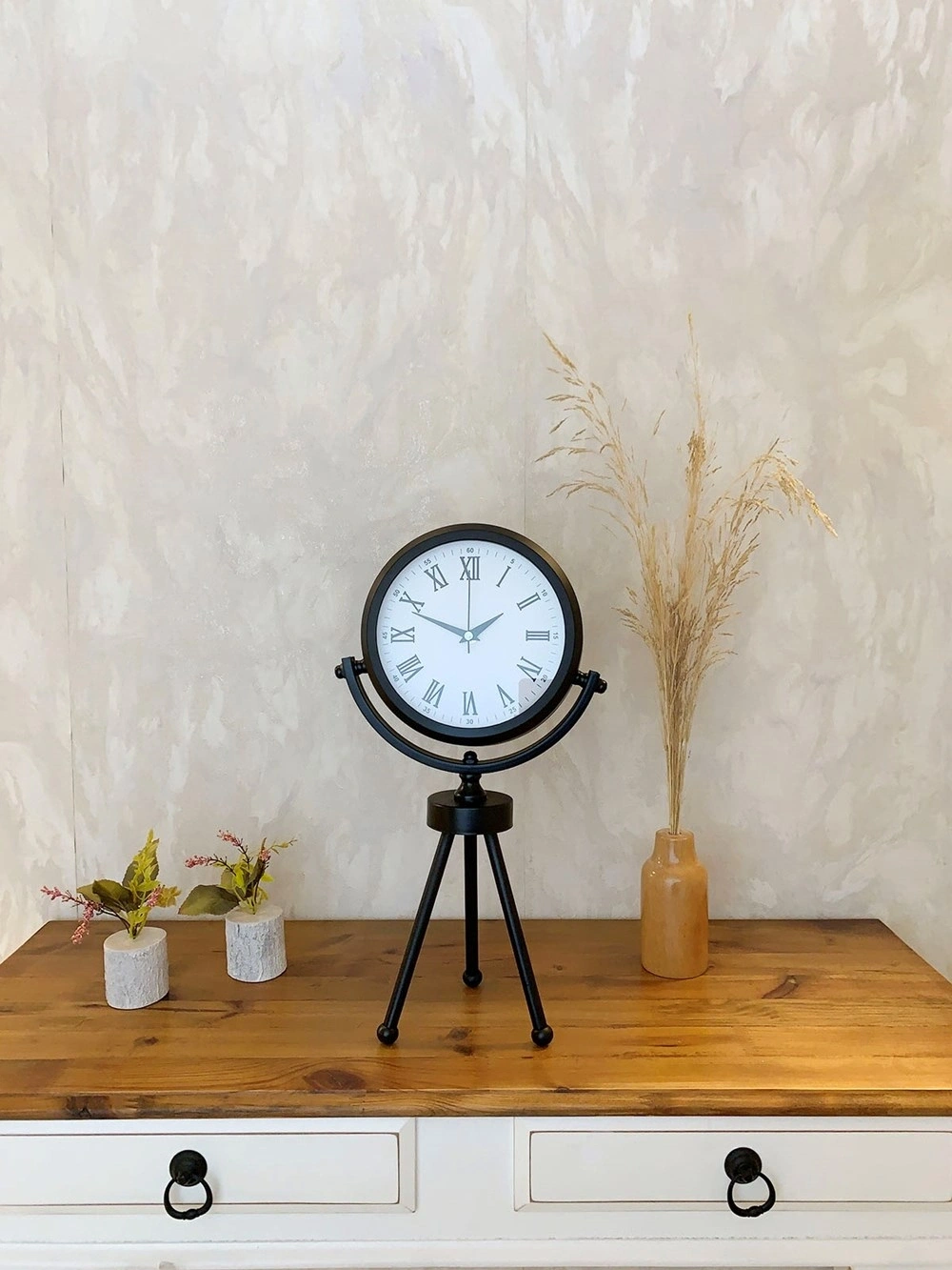 Şık ve modern tasarımıyla dikkat çeken  siyah fırın boyalı  mini tripod masa saatimiz, sessiz akar saniye mekanizmasıyla konforlu bir kullanım sunar. Gerçek cam koruma paneli sayesinde uzun ömürlü ve dayanıklıdır. Estetik görünümüyle hem ev hem de iş yerleri için ideal bir dekoratif üründür.