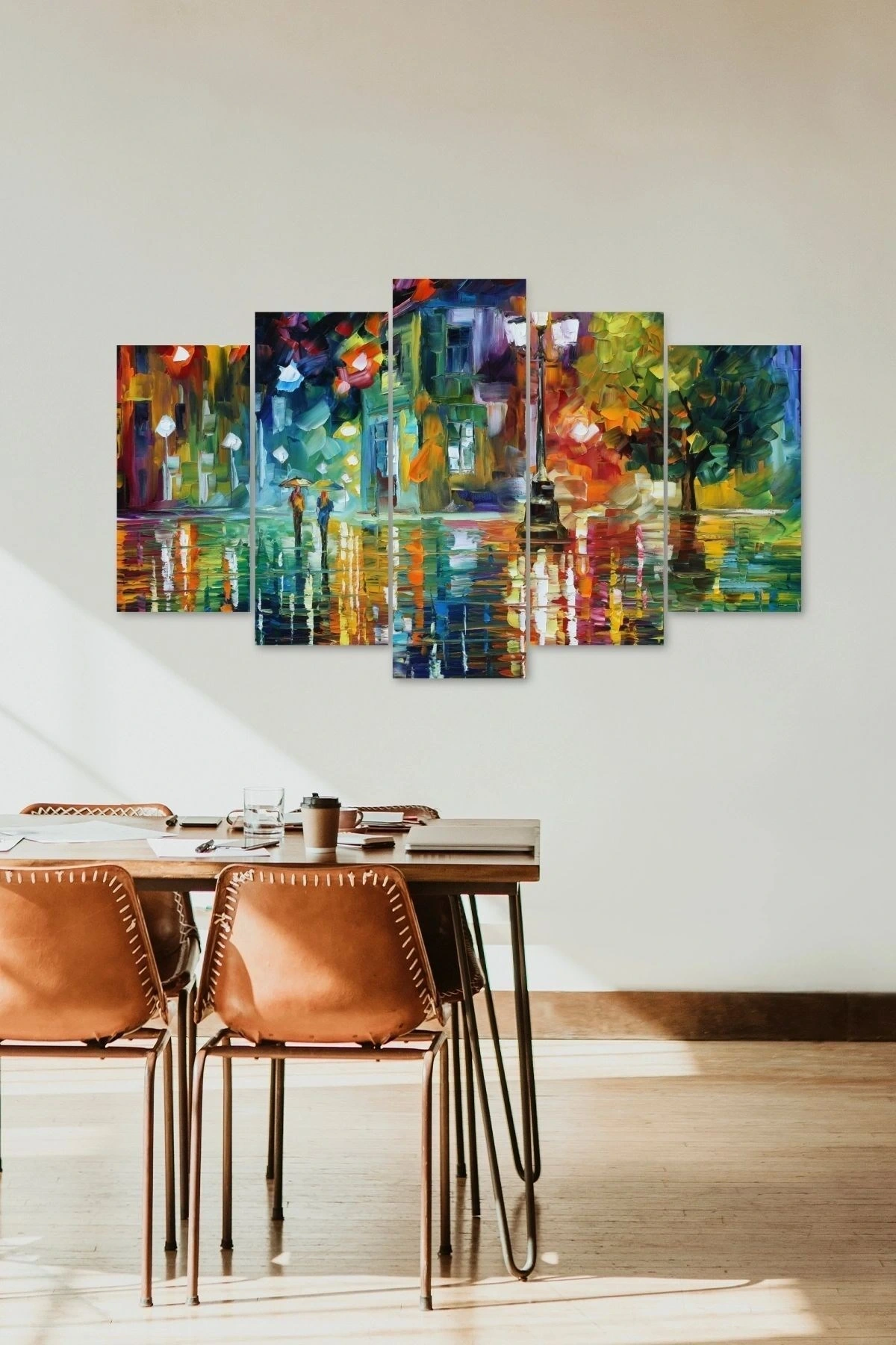 Modern tasarımıyla dikkat çeken bu 5 parçalı ahşap tablo, sonbaharın hüzün ve yağmur temalı estetik bir atmosfer yaratır; Dayanıklı MDF malzemesi sayesinde uzun ömürlü kullanım sunar ve mekanınıza şıklık katar; Her bir parçanın ayrı ayrı tasarlanmış olması, dekorasyonunuza özgün bir dokunuş ekler ve kişisel zevkinize göre düzenleme imkanı sağlar; Modern stil sahibi olan bu tablo, çağdaş dekorasyon anlayışınıza uyum sağlayarak evinizin veya ofisinizin havasını değiştirir;