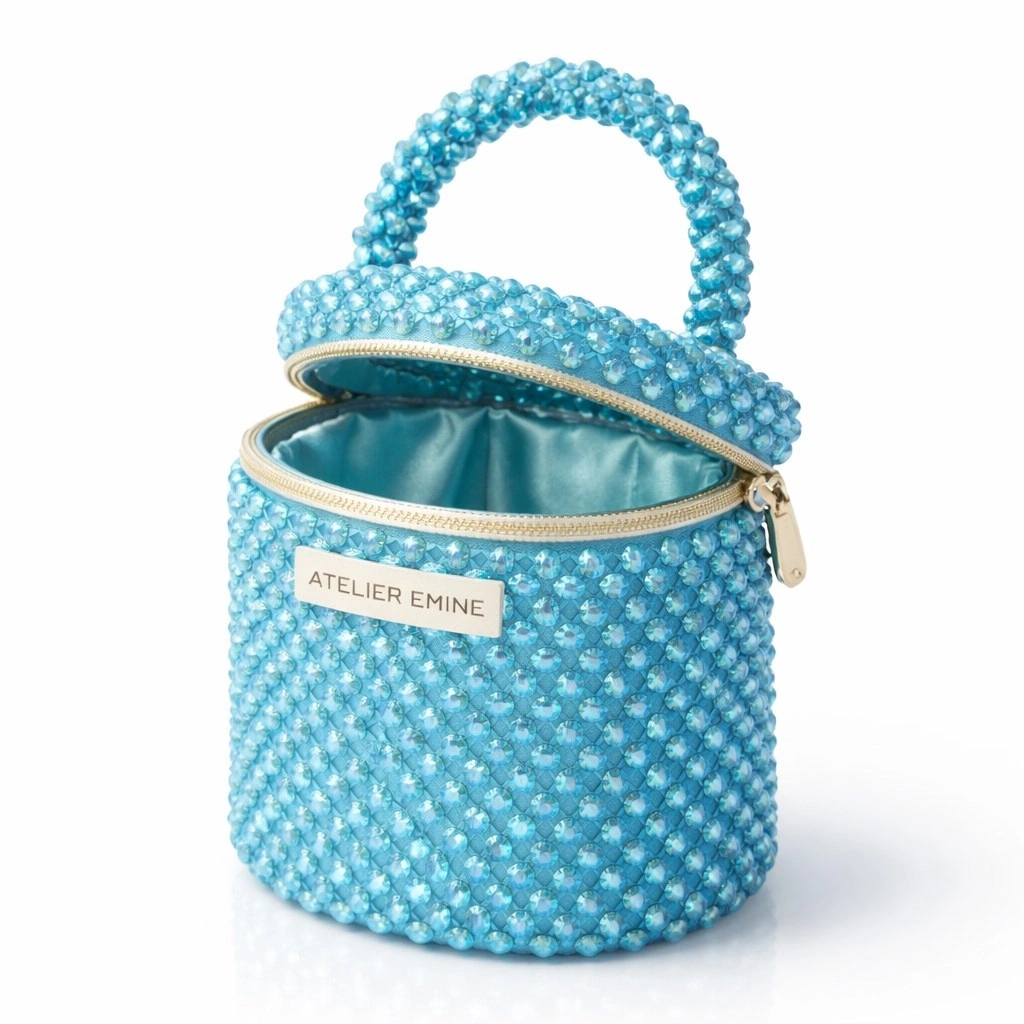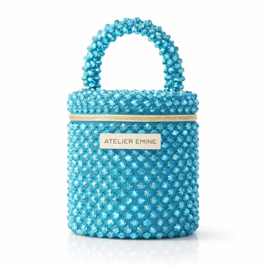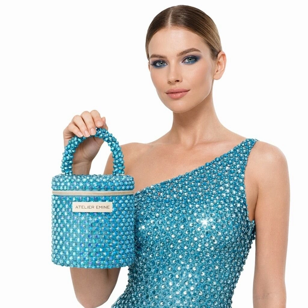 Atelier Emine’in Crystal Gelato Couture serisine ait Sorbetto Sea, 8 mm optik sınıfı kristal boncukların yüksek dayanımlı misina ile örülmesiyle tamamen el işçiliğiyle üretilmiş, mimari netlikte formu olan premium mini çanta modelidir.