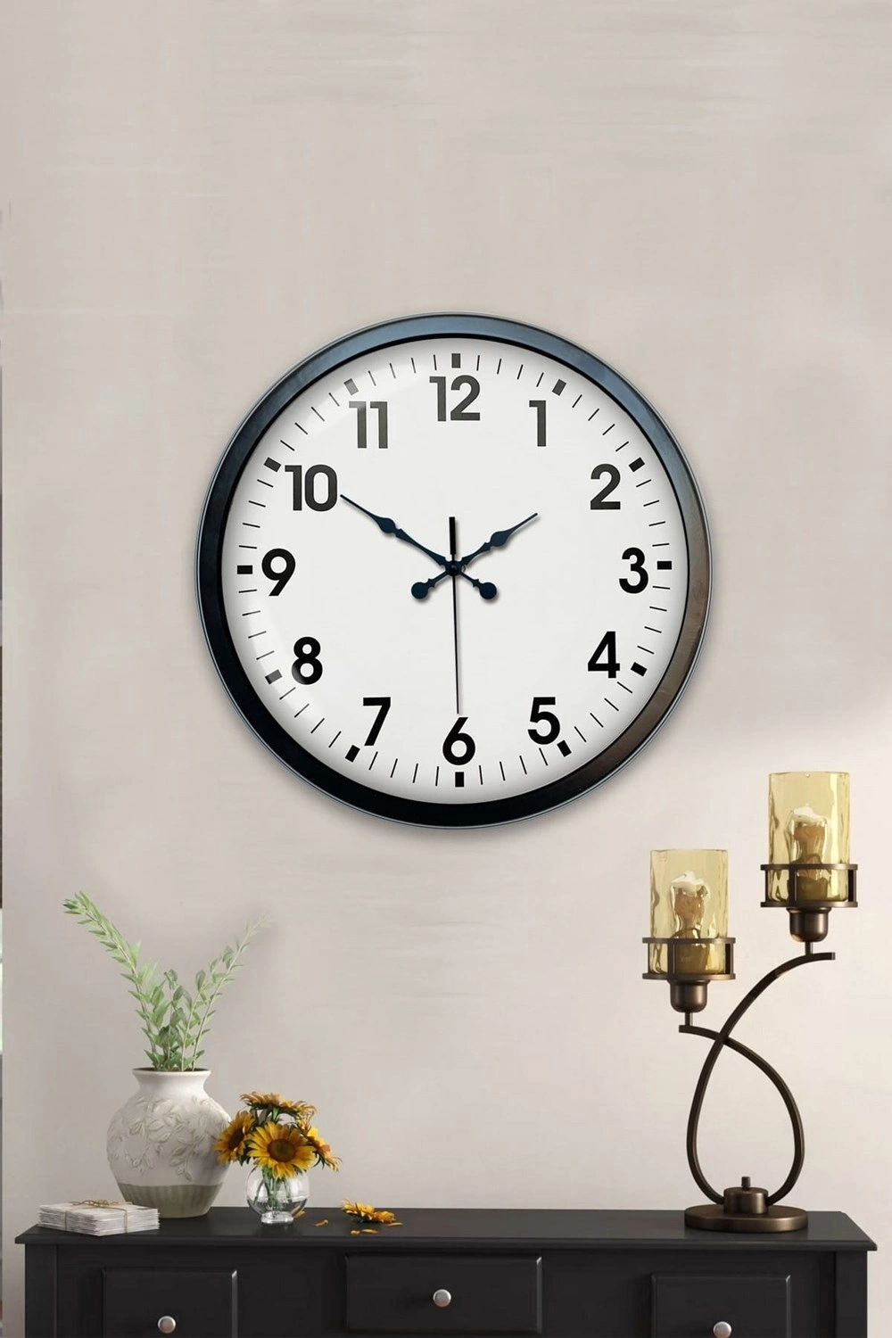 With its 40 cm wide face, it stands out as a decorative object on the wall. Its black frame provides a perfect harmony in modern, loft, industrial, and minimal decorations. It is a durable product that can be used for many years with its robust metal body and quality glass surface.