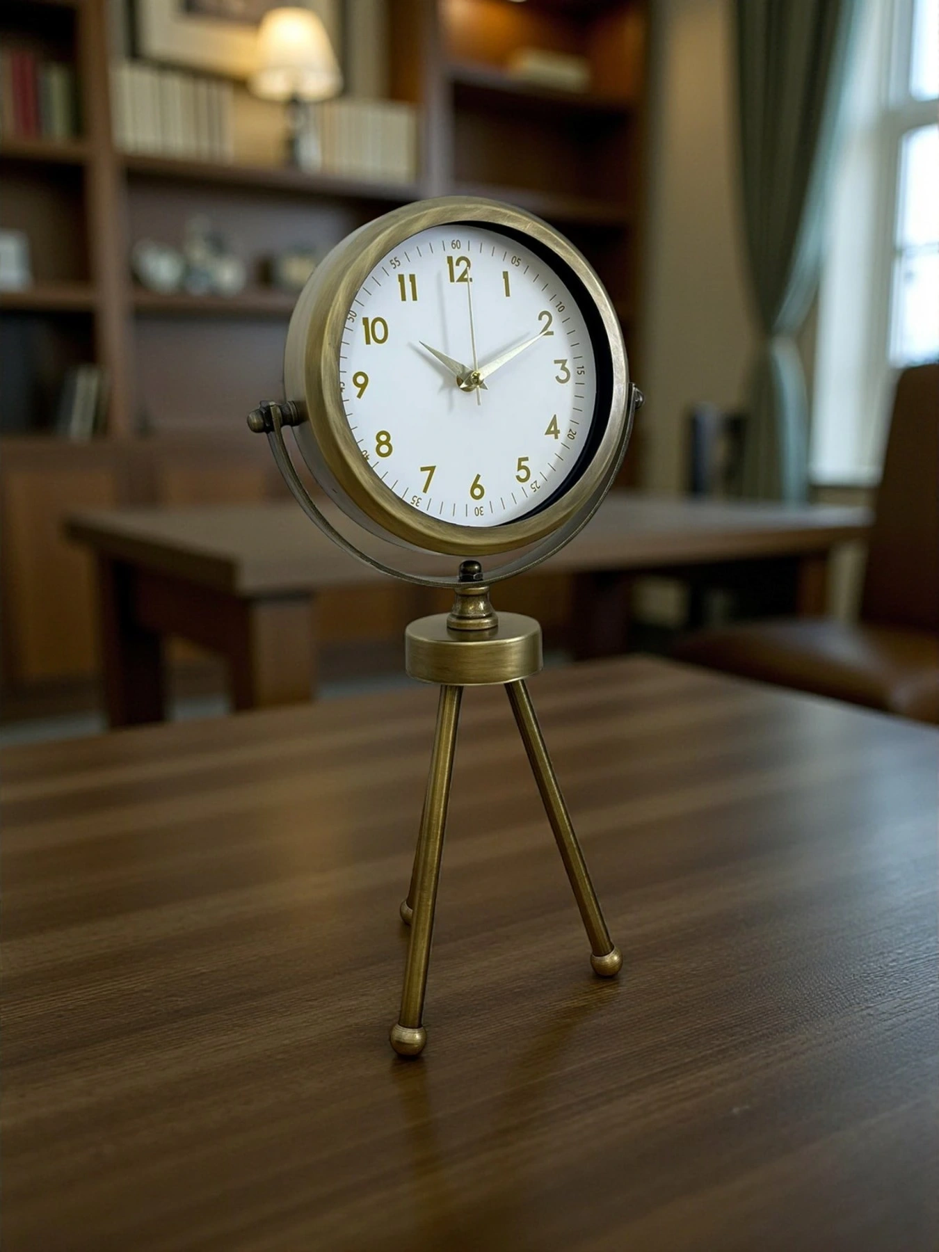 Evinizin ve ofisinizin dekorasyonuna modern, zarif ve kalıcı bir dokunuş katmak isteyenler için tasarlanan bu 45 x 25 cm eskitme tripod masa saati, tamamen metal gövdesi, üç ayaklı sağlam tasarımı ve estetik görünümüyle dikkat çeken özel bir dekoratif objedir. Eskitme antik bronz kaplaması, ürüne vintage sıcaklığı katarken; beyaz zemin üzerinde bulunan gold rakamlar modern bir şıklık sunar.