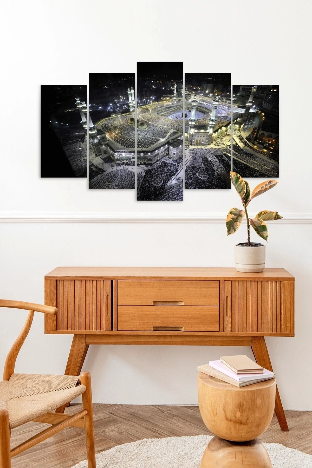 Klasik tasarımıyla evinizin dekorasyonuna zarif bir dokunuş ekleyen Kabe manzarası 5 parçalı MDF tablo, mekanınıza huzur ve dinginlik katıyor; Yüksek kaliteli MDF malzemesi sayesinde uzun ömürlü kullanım sunan bu tablo, dayanıklılığı ve estetiği bir arada barındırıyor; Ahşap işçiliğinin ince detaylarıyla süslenmiş olan bu eser, her bir parçada özenle işlenmiş desenlerle göz alıcı bir görünüm sergiliyor;