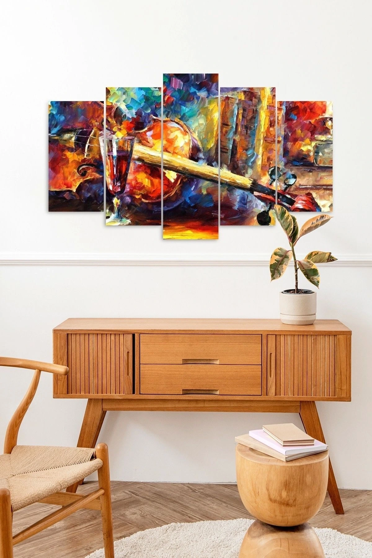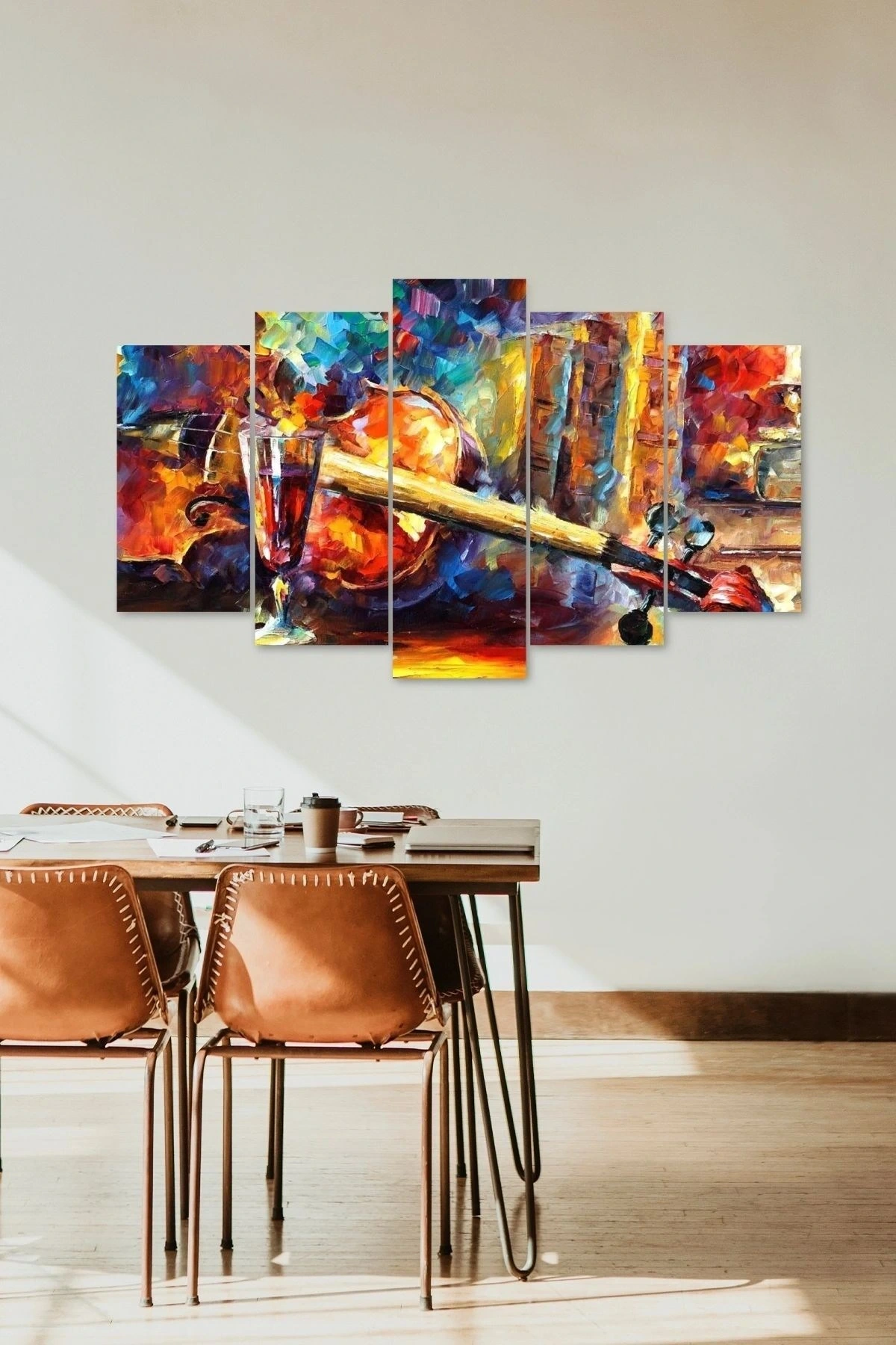 - Modern tasarımıyla dikkat çeken bu 5 parçalı MDF tablo, evinizin dekorasyonuna şık bir dokunuş katıyor; - Kaliteli MDF malzemesi sayesinde uzun ömürlü kullanım sunar ve dayanıklılığıyla öne çıkıyor; - Keman ve şarap temalı bu eser, müzik ve şarap severler için ideal bir hediye seçeneği olarak öne çıkıyor;