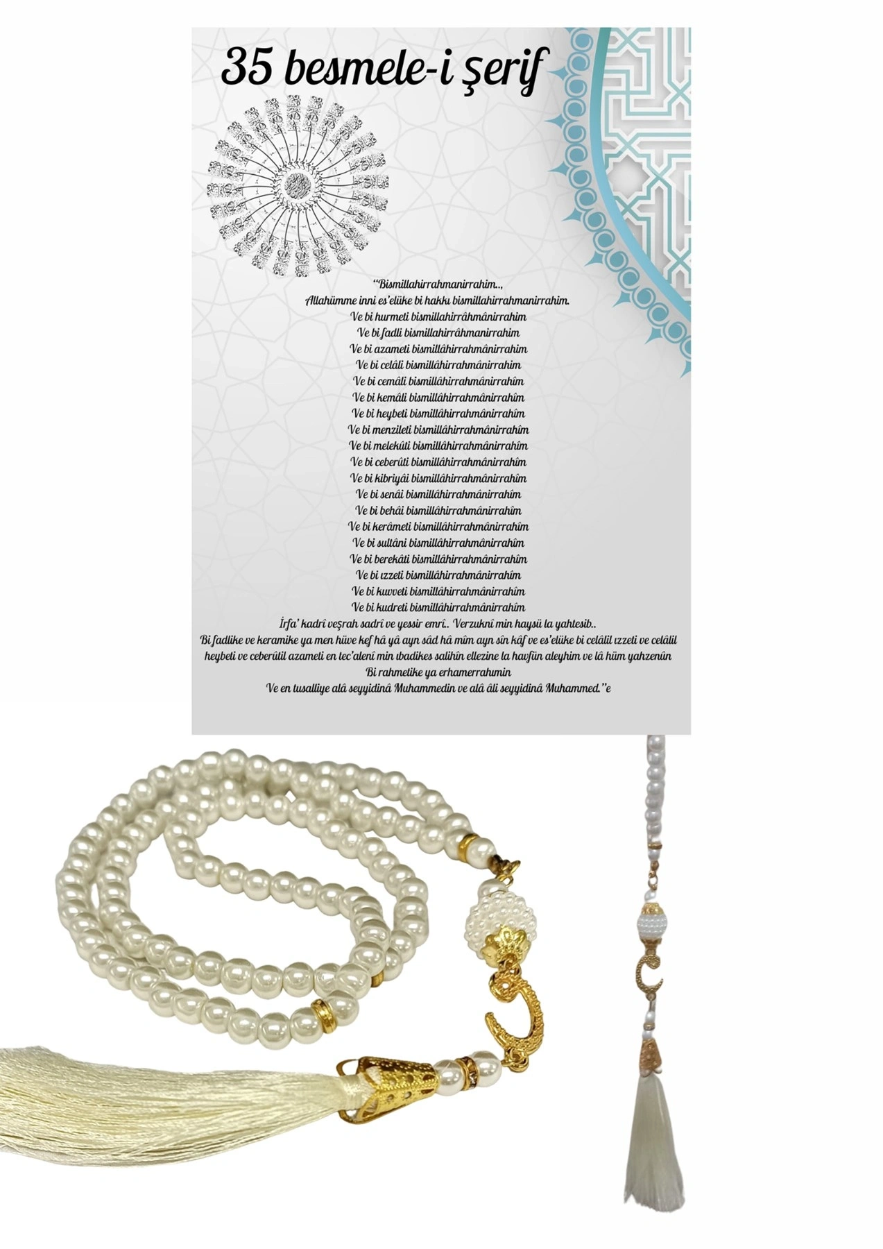 Namaz Tesbihi Vavlı 99'lu Cam İncili 35 Besmele-i Şerif Dua Kartı İle Krem Renk Hediyelik